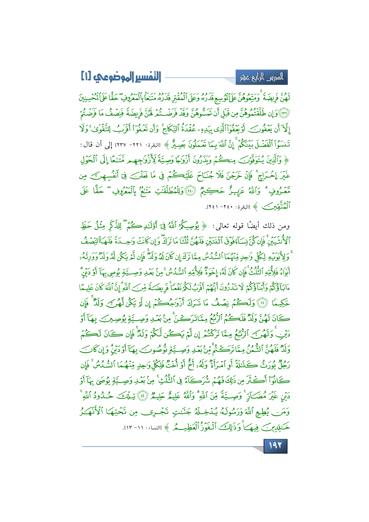 لَهُنَّ فَرِيضَةً وَمَتِّعُوهُنَّ عَلَى الْمُوسِعِ قَدَرُهُ وَعَلَى الْمُقْتِرِ قَدَرُهُ مَتَاعًا بِالْمَعْرُوفِ حَقًّا عَلَى الْمُحْسِنِينَ * وَإِنْ طَلَّقْتُمُوهُنَّ مِنْ قَبْلِ أَنْ تَمَسُّوهُنَّ وَقَدْ فَرَضْتُمْ لَهُنَّ فَرِيضَةً فَنِصْفُ مَا فَرَضْتُمْ إِلَّا أَنْ يَعْفُونَ أَوْ يَعْفُوَ الَّذِي بِيَدِهِ عُقْدَةُ النِّكَاحِ وَأَنْ تَعْفُوا أَقْرَبُ لِلتَّقْوَى وَلَا تَنْسَوُا الْفَضْلَ بَيْنَكُمْ إِنَّ اللَّهَ بِمَا تَعْمَلُونَ بَصِيرٌ} (البقرة: 221 - 239) إلى أن قال: {وَالَّذِينَ يُتَوَفَّوْنَ مِنْكُمْ وَيَذَرُونَ أَزْوَاجًا وَصِيَّةً لِأَزْوَاجِهِمْ مَتَاعًا إِلَى الْحَوْلِ غَيْرَ إِخْرَاجٍ فَإِنْ خَرَجْنَ فَلَا جُنَاحَ عَلَيْكُمْ فِي مَا فَعَلْنَ فِي أَنْفُسِهِنَّ مِنْ مَعْرُوفٍ وَاللَّهُ عَزِيزٌ حَكِيمٌ * وَلِلْمُطَلَّقَاتِ مَتَاعٌ بِالْمَعْرُوفِ حَقًّا عَلَى الْمُتَّقِينَ} (البقرة: 240 - 241).