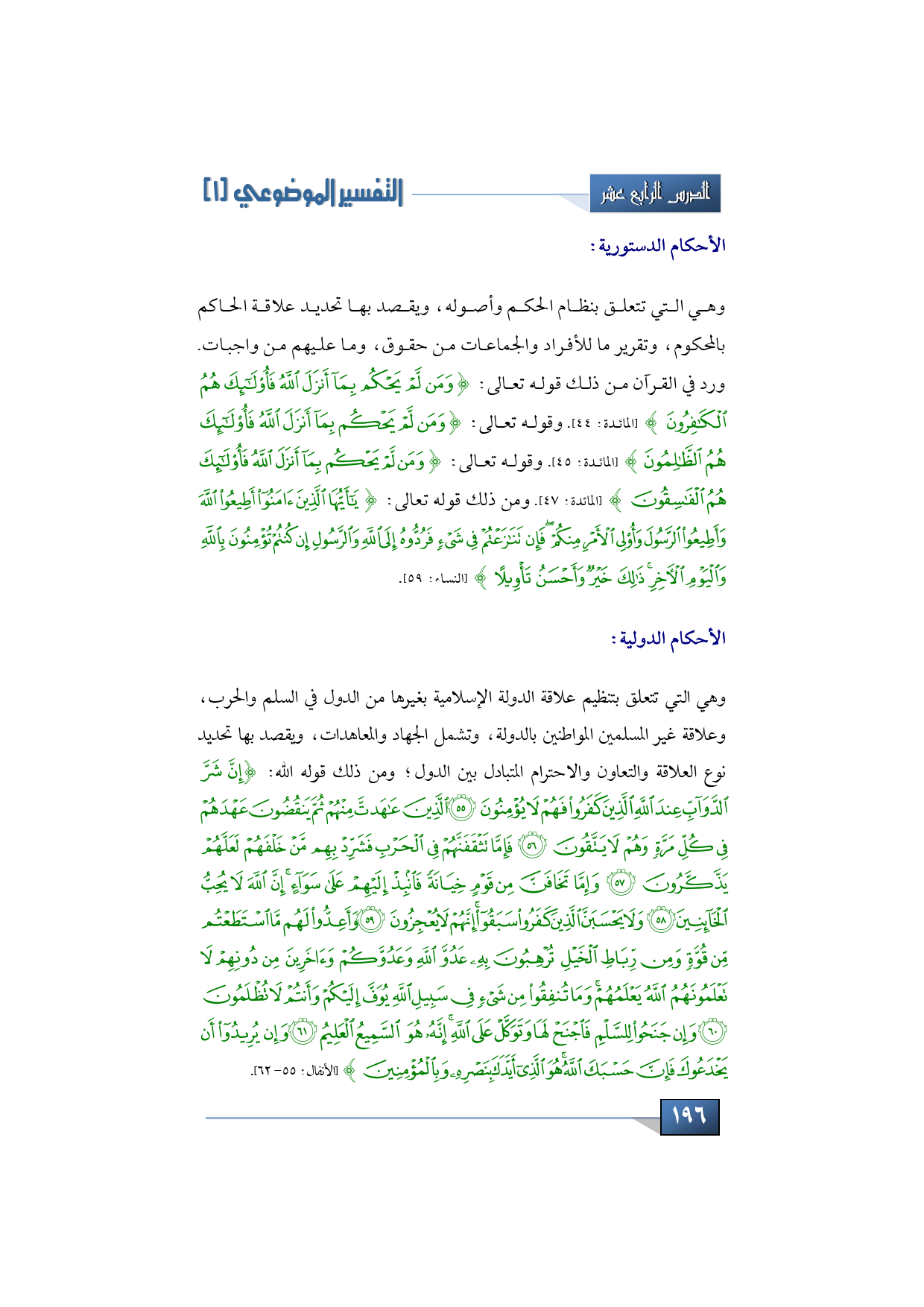 وهي التي تتعلق بتنظيم علاقة الدولة الإسلامية بغيرها من الدول في السلم والحرب، وعلاقة غير المسلمين المواطنين بالدولة، وتشمل الجهاد والمعاهدات، ويقصد بها تحديد نوع العلاقة والتعاون والاحترام المتبادل بين الدول؛ ومن ذلك قوله تعالى: {إِنَّ شَرَّ الدَّوَابِّ عِنْدَ اللَّهِ الَّذِينَ كَفَرُوا فَهُمْ لَا يُؤْمِنُونَ * الَّذِينَ عَاهَدْتَ مِنْهُمْ ثُمَّ يَنْقُضُونَ عَهْدَهُمْ فِي كُلِّ مَرَّةٍ وَهُمْ لَا يَتَّقُونَ * فَإِمَّا تَثْقَفَنَّهُمْ فِي الْحَرْبِ فَشَرِّدْ بِهِمْ مَنْ خَلْفَهُمْ لَعَلَّهُمْ يَذَّكَّرُونَ * وَإِمَّا تَخَافَنَّ مِنْ قَوْمٍ خِيَانَةً فَانْبِذْ إِلَيْهِمْ عَلَى سَوَاءٍ إِنَّ اللَّهَ لَا يُحِبُّ الْخَائِنِينَ * وَلَا يَحْسَبَنَّ الَّذِينَ كَفَرُوا سَبَقُوا إِنَّهُمْ لَا يُعْجِزُونَ * وَأَعِدُّوا لَهُمْ مَا اسْتَطَعْتُمْ مِنْ قُوَّةٍ وَمِنْ رِبَاطِ الْخَيْلِ تُرْهِبُونَ بِهِ عَدُوَّ اللَّهِ وَعَدُوَّكُمْ وَآخَرِينَ مِنْ دُونِهِمْ لَا تَعْلَمُونَهُمُ اللَّهُ يَعْلَمُهُمْ وَمَا تُنْفِقُوا مِنْ شَيْءٍ فِي سَبِيلِ اللَّهِ يُوَفَّ إِلَيْكُمْ وَأَنْتُمْ لَا تُظْلَمُونَ * وَإِنْ جَنَحُوا لِلسَّلْمِ فَاجْنَحْ لَهَا وَتَوَكَّلْ عَلَى اللَّهِ إِنَّهُ هُوَ السَّمِيعُ الْعَلِيمُ * وَإِنْ يُرِيدُوا أَنْ يَخْدَعُوكَ فَإِنَّ حَسْبَكَ اللَّهُ هُوَ الَّذِي أَيَّدَكَ بِنَصْرِهِ وَبِالْمُؤْمِنِينَ} (الأنفال: 55 - 62).