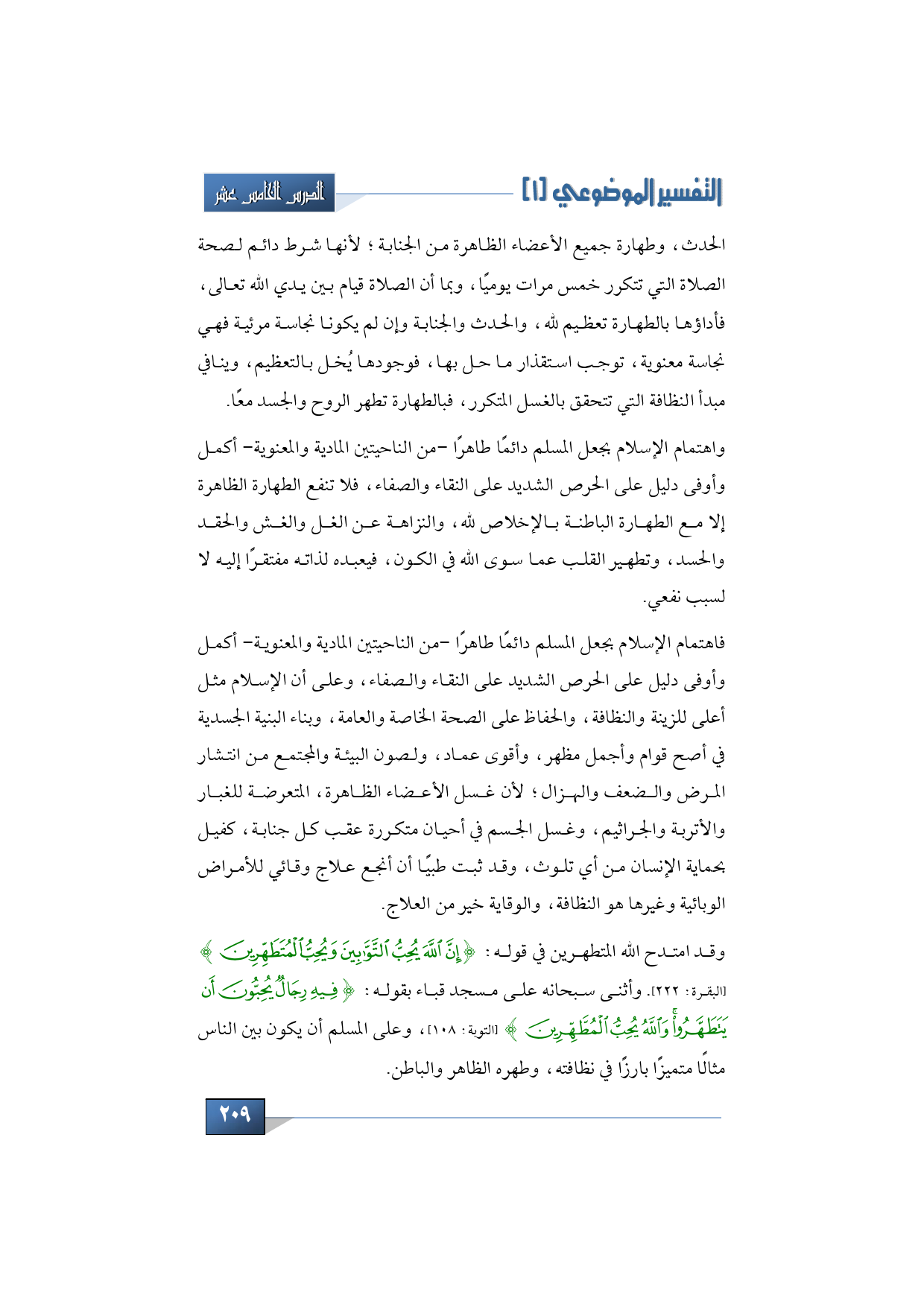 وقد امتدح الله المتطهرين في قوله: {إِنَّ اللَّهَ يُحِبُّ التَّوَّابِينَ وَيُحِبُّ الْمُتَطَهِّرِينَ} (البقرة: 222). وأثنى سبحانه على مسجد قباء بقوله: {فِيهِ رِجَالٌ يُحِبُّونَ أَنْ يَتَطَهَّرُوا وَاللَّهُ يُحِبُّ الْمُطَّهِّرِينَ} (التوبة: 108)، وعلى المسلم أن يكون بين الناس مثالًا متميزًا بارزًا في نظافته، وطهره الظاهر والباطن.