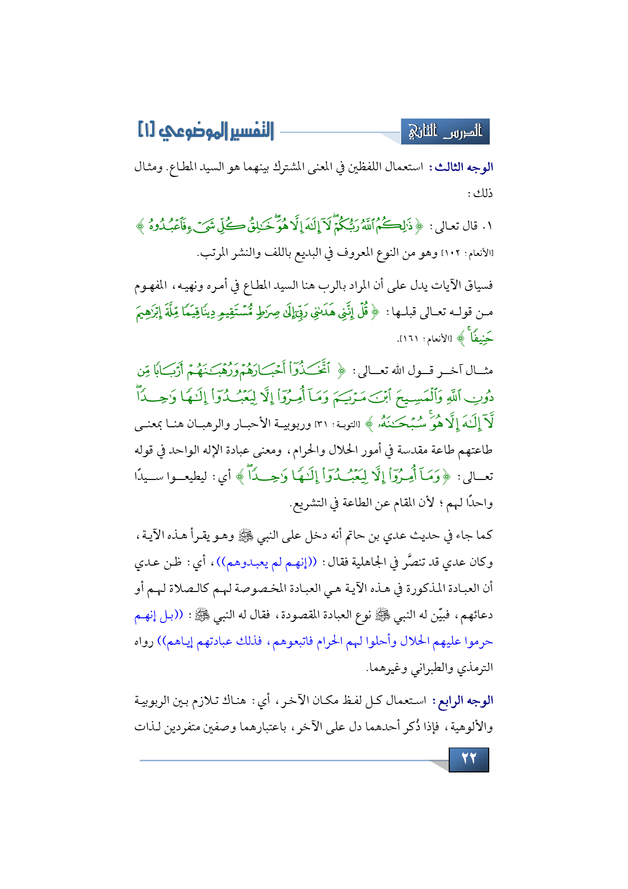 مثال آخر قول الله تعالى: {اتَّخَذُوا أَحْبَارَهُمْ وَرُهْبَانَهُمْ أَرْبَابًا مِنْ دُونِ اللَّهِ وَالْمَسِيحَ ابْنَ مَرْيَمَ وَمَا أُمِرُوا إِلَّا لِيَعْبُدُوا إِلَهًا وَاحِدًا لَا إِلَهَ إِلَّا هُوَ} (التوبة: 31) وربوبية الأحبار والرهبان هنا بمعنى طاعتهم طاعة مقدسة في أمور الحلال والحرام، ومعنى عبادة الإله الواحد في قوله تعالى: {وَمَا أُمِرُوا إِلَّا لِيَعْبُدُوا إِلَهًا وَاحِدًا} أي: ليطيعوا سيدًا واحدًا لهم؛ لأن المقام عن الطاعة في التشريع.
