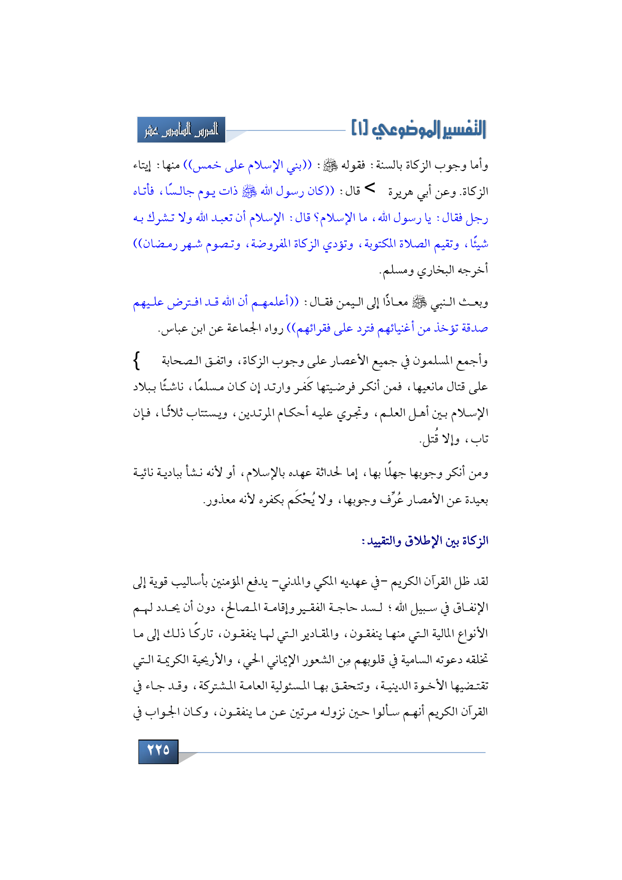 لقد ظل القرآن الكريم -في عهديه المكي والمدني- يدفع المؤمنين بأساليب قوية إلى الإنفاق في سبيل الله؛ لسد حاجة الفقير وإقامة المصالح، دون أن يحدد لهم الأنواع المالية التي منها ينفقون، والمقادير التي لها ينفقون، تاركًا ذلك إلى ما تخلقه دعوته السامية في قلوبهم مِن الشعور الإيماني الحي، والأريحية الكريمة التي تقتضيها الأخوة الدينية، وتتحقق بها المسئولية العامة المشتركة، وقد جاء في القرآن الكريم أنهم سألوا حين نزوله مرتين عن ما ينفقون، وكان الجواب في