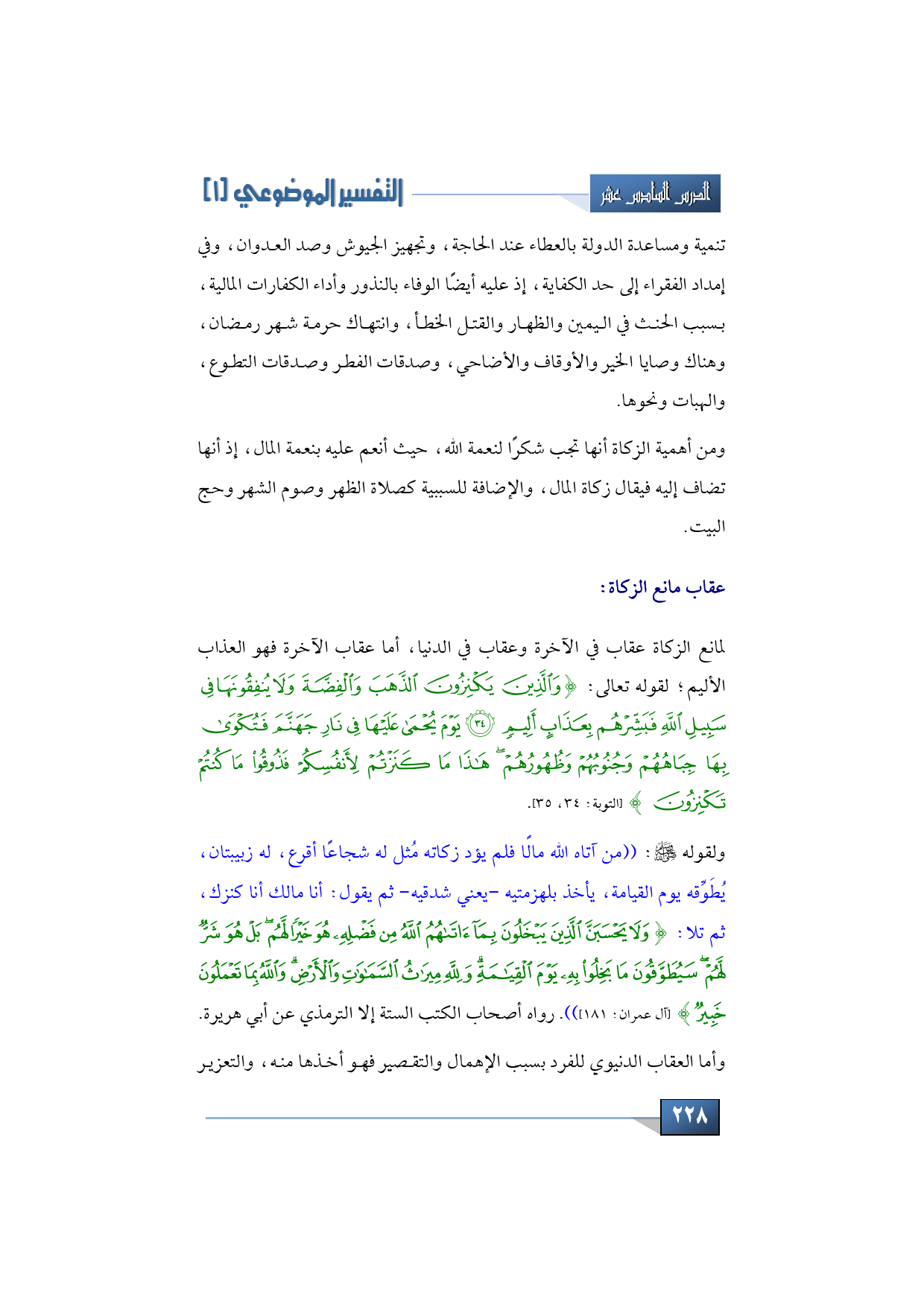 ولقوله -صلى الله عليه وسلم-: ((من آتاه الله مالًا فلم يؤد زكاته مُثل له شجاعًا أقرع، له زبيبتان، يُطَوِّقه يوم القيامة، يأخذ بلهزمتيه -يعني شدقيه- ثم يقول: أنا مالك أنا كنزك، ثم تلا: {وَلَا يَحْسَبَنَّ الَّذِينَ يَبْخَلُونَ بِمَا آتَاهُمُ اللَّهُ مِنْ فَضْلِهِ هُوَ خَيْرًا لَهُمْ بَلْ هُوَ شَرٌّ لَهُمْ سَيُطَوَّقُونَ مَا بَخِلُوا بِهِ يَوْمَ الْقِيَامَةِ وَلِلَّهِ مِيرَاثُ السَّمَاوَاتِ وَالْأَرْضِ وَاللَّهُ بِمَا تَعْمَلُونَ خَبِيرٌ} (آل عمران: 181))). رواه أصحاب الكتب الستة إلا الترمذي عن أبي هريرة.