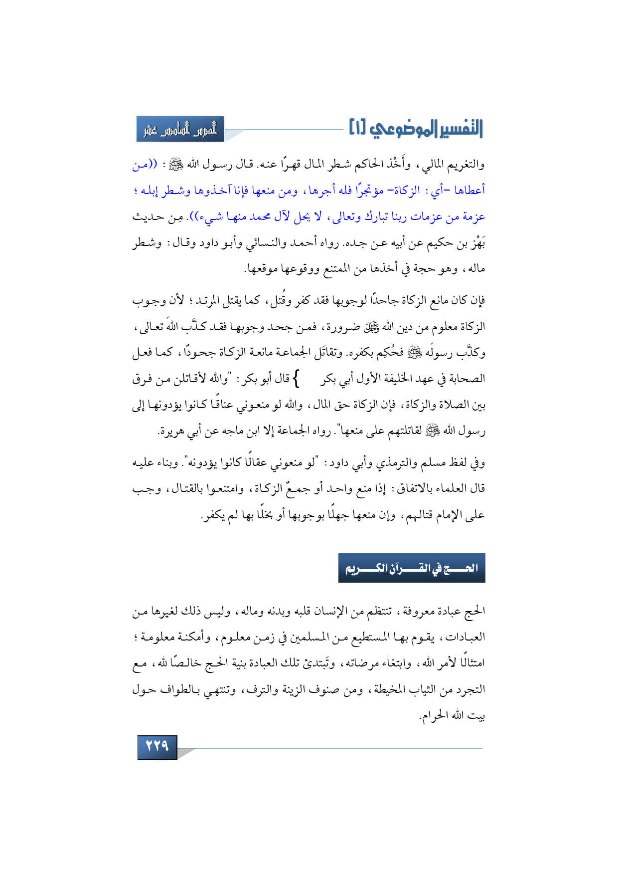 والتغريم المالي، وأَخْذ الحاكم شطر المال قهرًا عنه. قال رسول الله -صلى الله عليه وسلم-: ((من أعطاها -أي: الزكاة- مؤتجرًا فله أجرها، ومن منعها فإنا آخذوها وشطر إبله؛ عزمة من عزمات ربنا تبارك وتعالى، لا يحل لآل محمد منها شيء)). مِن حديث بَهْز بن حكيم عن أبيه عن جده. رواه أحمد والنسائي وأبو داود وقال: وشطر ماله، وهو حجة في أخذها من الممتنع ووقوعها موقعها.