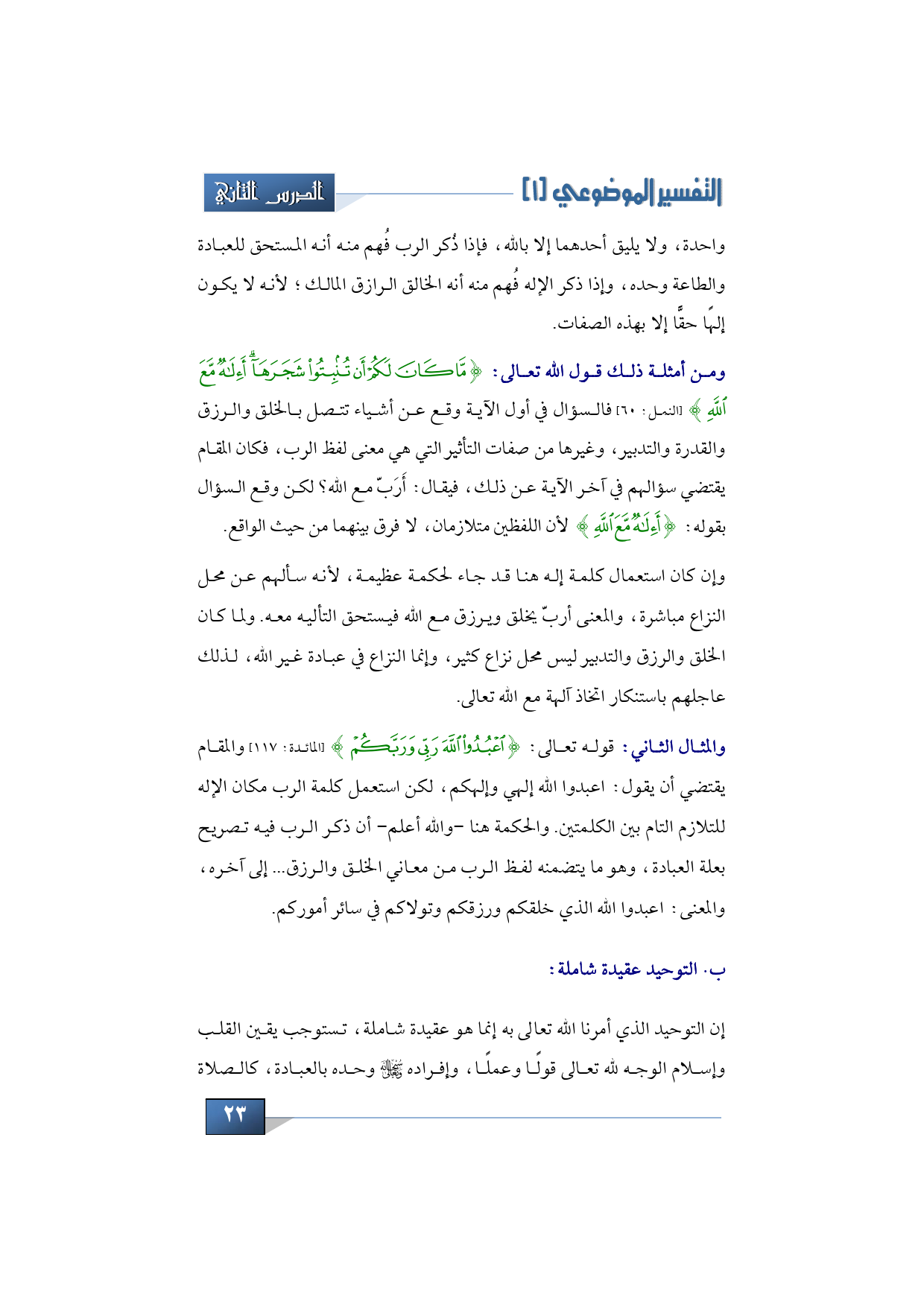 والمثال الثاني: قوله تعالى: {اعْبُدُوا اللَّهَ رَبِّي وَرَبَّكُمْ} (المائدة: 117) والمقام يقتضي أن يقول: اعبدوا الله إلهي وإلهكم، لكن استعمل كلمة الرب مكان الإله للتلازم التام بين الكلمتين. والحكمة هنا -والله أعلم- أن ذكر الرب فيه تصريح بعلة العبادة، وهو ما يتضمنه لفظ الرب من معاني الخلق والرزق ... إلى آخره، والمعنى: اعبدوا الله الذي خلقكم ورزقكم وتولاكم في سائر أموركم.
