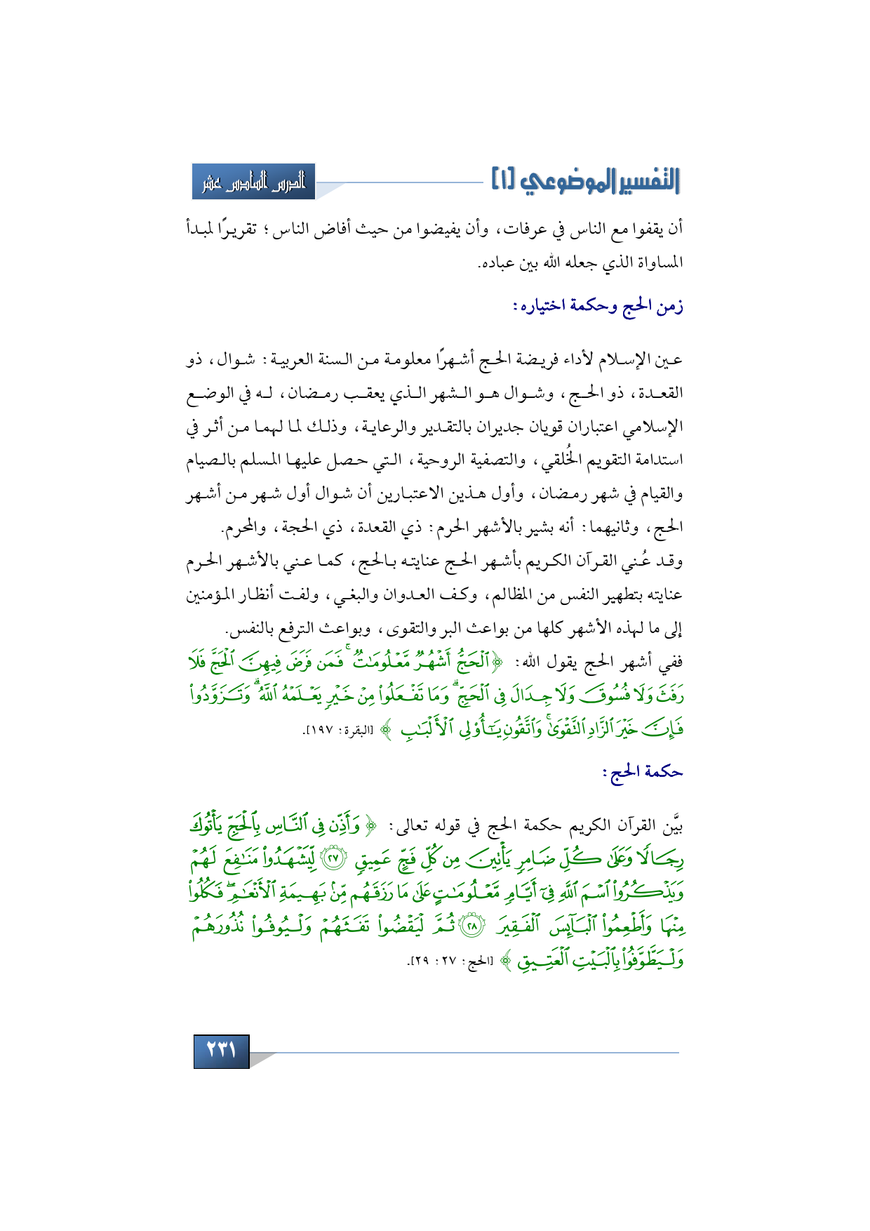 بيَّن القرآن الكريم حكمة الحج في قوله تعالى: {وَأَذِّنْ فِي النَّاسِ بِالْحَجِّ يَأْتُوكَ رِجَالًا وَعَلَى كُلِّ ضَامِرٍ يَأْتِينَ مِنْ كُلِّ فَجٍّ عَمِيقٍ * لِيَشْهَدُوا مَنَافِعَ لَهُمْ وَيَذْكُرُوا اسْمَ اللَّهِ فِي أَيَّامٍ مَعْلُومَاتٍ عَلَى مَا رَزَقَهُمْ مِنْ بَهِيمَةِ الْأَنْعَامِ فَكُلُوا مِنْهَا وَأَطْعِمُوا الْبَائِسَ الْفَقِيرَ* ثُمَّ لْيَقْضُوا تَفَثَهُمْ وَلْيُوفُوا نُذُورَهُمْ وَلْيَطَّوَّفُوا بِالْبَيْتِ الْعَتِيقِ} (الحج: 27: 29).