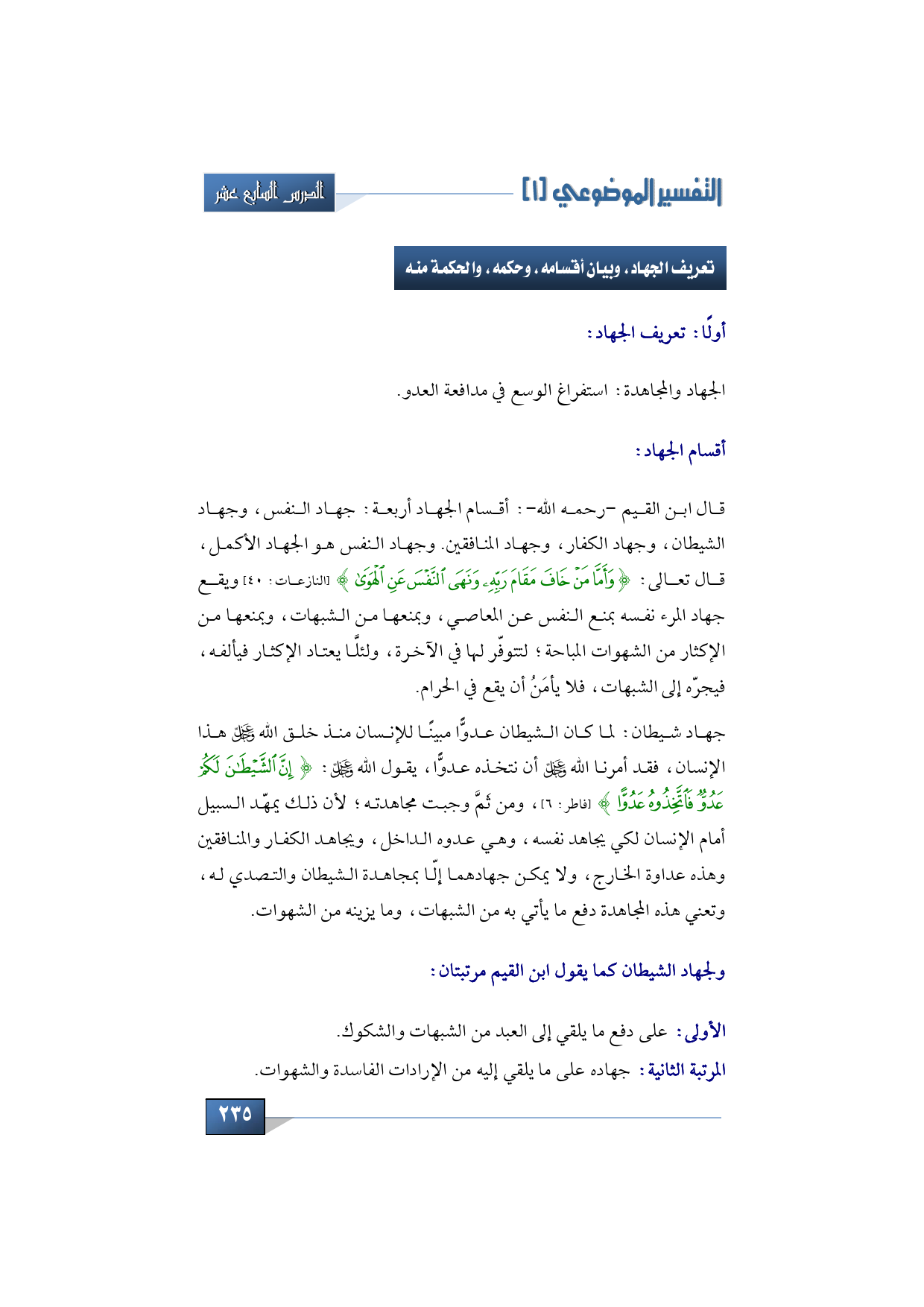 قال ابن القيم -رحمه الله-: أقسام الجهاد أربعة: جهاد النفس، وجهاد الشيطان، وجهاد الكفار، وجهاد المنافقين. وجهاد النفس هو الجهاد الأكمل، قال تعالى: {وَأَمَّا مَنْ خَافَ مَقَامَ رَبِّهِ وَنَهَى النَّفْسَ عَنِ الْهَوَى} (النازعات: 40) ويقع جهاد المرء نفسه بمنع النفس عن المعاصي، وبمنعها من الشبهات، وبمنعها من الإكثار من الشهوات المباحة؛ لتتوفّر لها في الآخرة، ولئلَّا يعتاد الإكثار فيألفه، فيجرّه إلى الشبهات، فلا يأمَنُ أن يقع في الحرام.