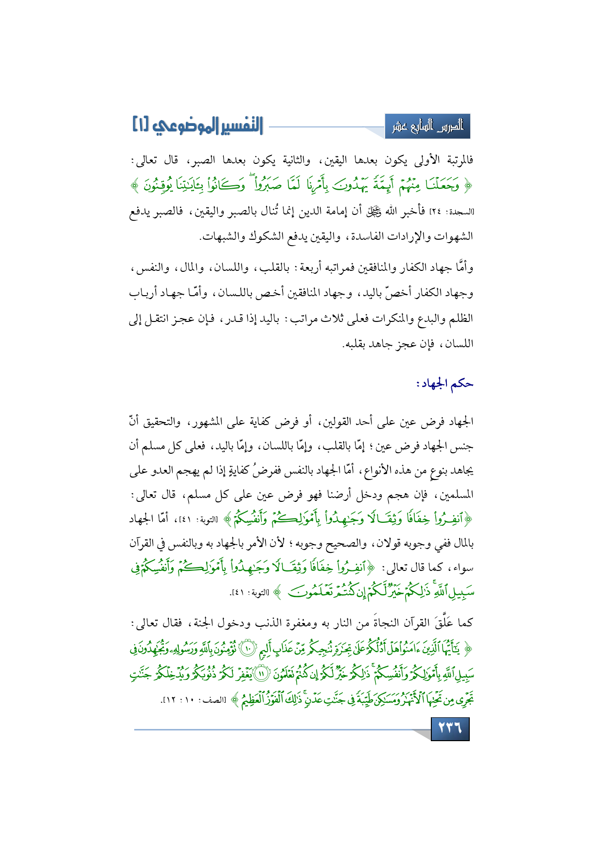 كما عَلَّقَ القرآن النجاةَ من النار به ومغفرة الذنب ودخول الجنة، فقال تعالى: {يَا أَيُّهَا الَّذِينَ آمَنُوا هَلْ أَدُلُّكُمْ عَلَى تِجَارَةٍ تُنْجِيكُمْ مِنْ عَذَابٍ أَلِيم * تُؤْمِنُونَ بِاللَّهِ وَرَسُولِهِ وَتُجَاهِدُونَ فِي سَبِيلِ اللَّهِ بِأَمْوَالِكُمْ وَأَنْفُسِكُمْ ذَلِكُمْ خَيْرٌ لَكُمْ إِنْ كُنْتُمْ تَعْلَمُونَ * يَغْفِرْ لَكُمْ ذُنُوبَكُمْ وَيُدْخِلْكُمْ جَنَّاتٍ تَجْرِي مِنْ تَحْتِهَا الْأَنْهَارُ وَمَسَاكِنَ طَيِّبَةً فِي جَنَّاتِ عَدْنٍ ذَلِكَ الْفَوْزُ الْعَظِيمُ} (الصف: 10: 12).