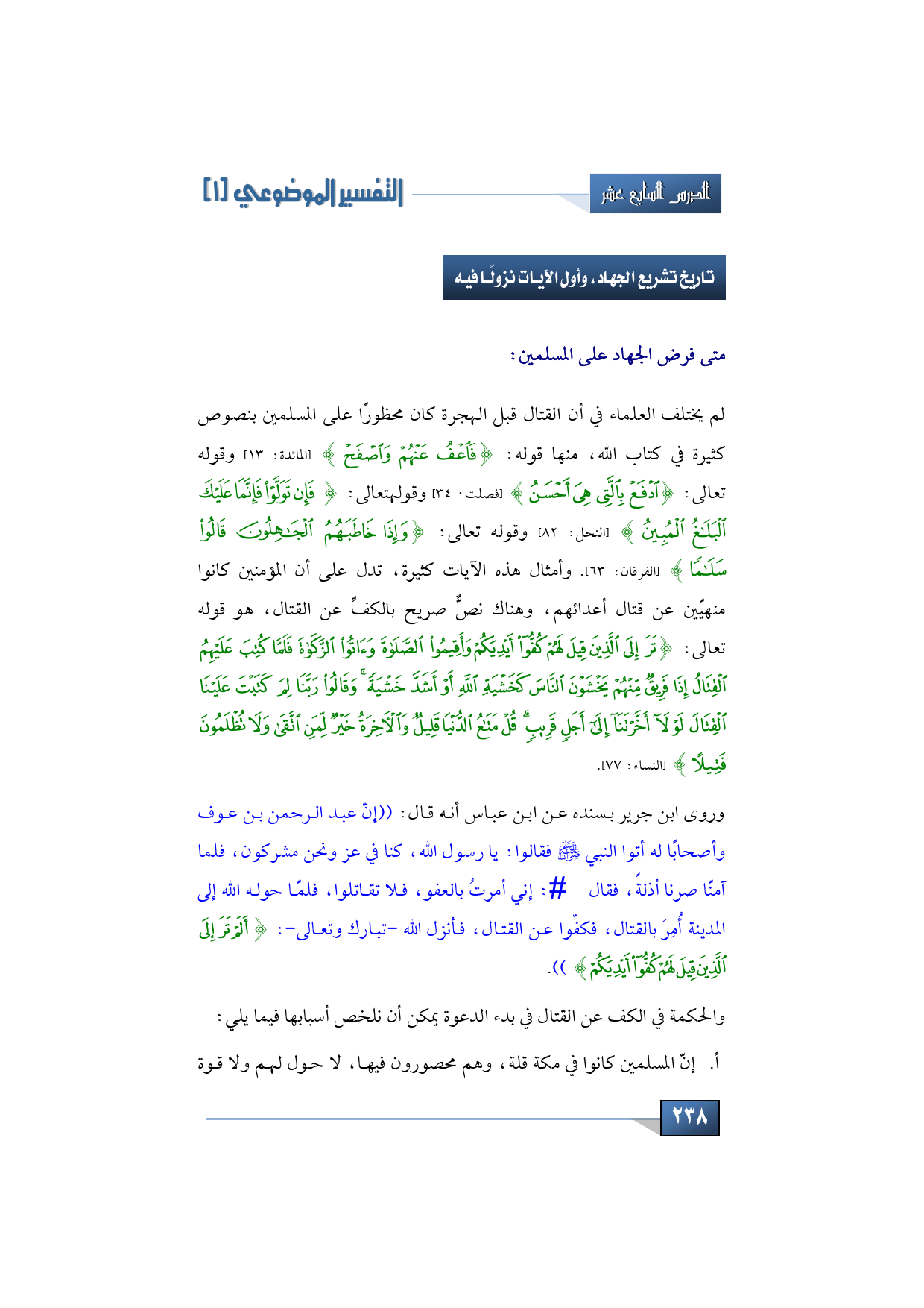 لم يختلف العلماء في أن القتال قبل الهجرة كان محظورًا على المسلمين بنصوص كثيرة في كتاب الله، منها قوله: {فَاعْفُ عَنْهُمْ وَاصْفَحْ} (المائدة: 13) وقوله تعالى: {ادْفَعْ بِالَّتِي هِيَ أَحْسَنُ} (فصلت: 34) وقولهتعالى: {فَإِنْ تَوَلَّوْا فَإِنَّمَا عَلَيْكَ الْبَلَاغُ الْمُبِين} (النحل: 82) وقوله تعالى: {وَإِذَا خَاطَبَهُمُ الْجَاهِلُونَ قَالُوا سَلَامً ا} (الفرقان: 63). وأمثال هذه الآيات كثيرة، تدل على أن المؤمنين كانوا منهيّين عن قتال أعدائهم، وهناك نصٌّ صريح بالكفِّ عن القتال، هو قوله تعالى: {أَلَمْ تَرَ إِلَى الَّذِينَ قِيلَ لَهُمْ كُفُّوا أَيْدِيَكُمْ وَأَقِيمُوا الصَّلَاةَ وَآتُوا الزَّكَاةَ فَلَمَّا كُتِبَ عَلَيْهِمُ الْقِتَالُ إِذَا فَرِيقٌ مِنْهُمْ يَخْشَوْنَ النَّاسَ كَخَشْيَةِ اللَّهِ أَوْ أَشَدَّ خَشْيَةً وَقَالُوا رَبَّنَا لِمَ كَتَبْتَ عَلَيْنَا الْقِتَالَ لَوْلَا أَخَّرْتَنَا إِلَى أَجَلٍ قَرِيبٍ قُلْ مَتَاعُ الدُّنْيَا قَلِيلٌ وَالْآخِرَةُ خَيْرٌ لِمَنِ اتَّقَى وَلَا تُظْلَمُونَ فَتِيلً ا} (النساء: 77).