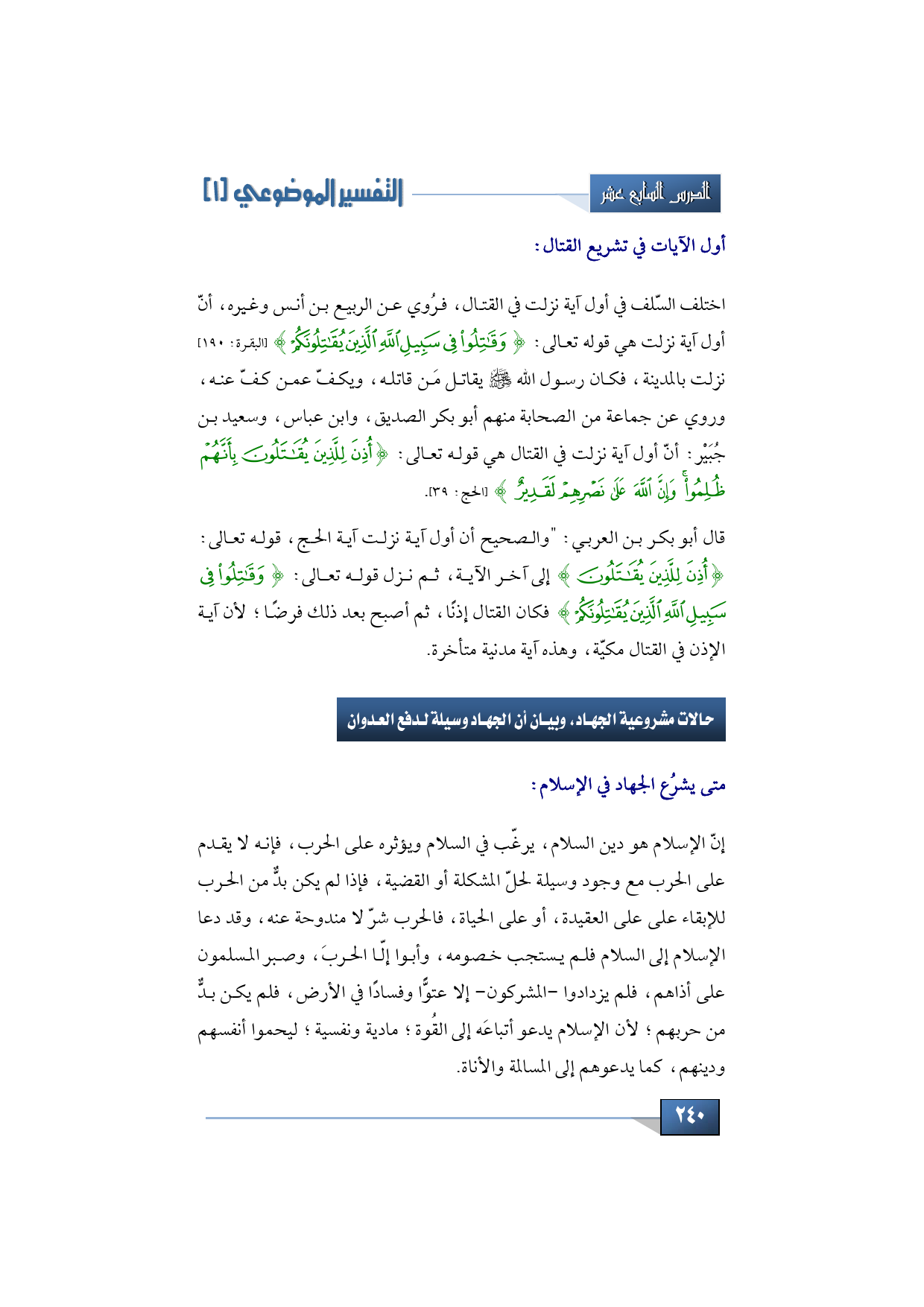 اختلف السّلف في أول آية نزلت في القتال، فرُوي عن الربيع بن أنس وغيره، أنّ أول آية نزلت هي قوله تعالى: {وَقَاتِلُوا فِي سَبِيلِ اللَّهِ الَّذِينَ يُقَاتِلُونَكُمْ} (البقرة: 190) نزلت بالمدينة، فكان رسول الله -صلى الله عليه وسلم- يقاتل مَن قاتله، ويكفّ عمن كفّ عنه، وروي عن جماعة من الصحابة منهم أبو بكر الصديق، وابن عباس، وسعيد بن جُبَيْر: أنّ أول آية نزلت في القتال هي قوله تعالى: {أُذِنَ لِلَّذِينَ يُقَاتَلُونَ بِأَنَّهُمْ ظُلِمُوا وَإِنَّ اللَّهَ عَلَى نَصْرِهِمْ لَقَدِير} (الحج: 39).