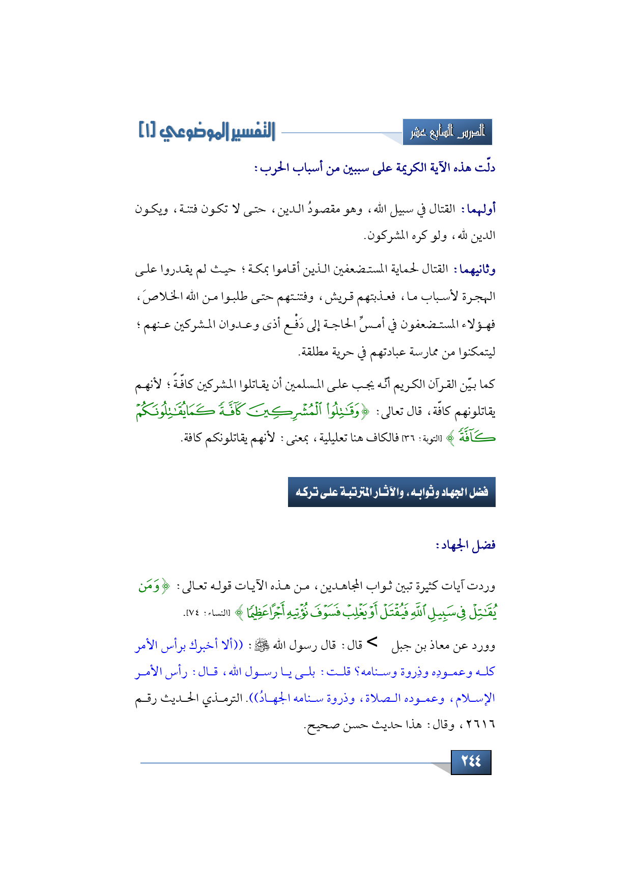 وورد عن معاذ بن جبل -رضي الله عنه- قال: قال رسول الله -صلى الله عليه وسلم-: ((ألا أخبرك برأس الأمر كله وعمودِه وذِروة وسنامه؟ قلت: بلى يا رسول الله، قال: رأس الأمر الإسلام، وعموده الصلاة، وذروة سنامه الجهادُ)). الترمذي الحديث رقم 2616، وقال: هذا حديث حسن صحيح.