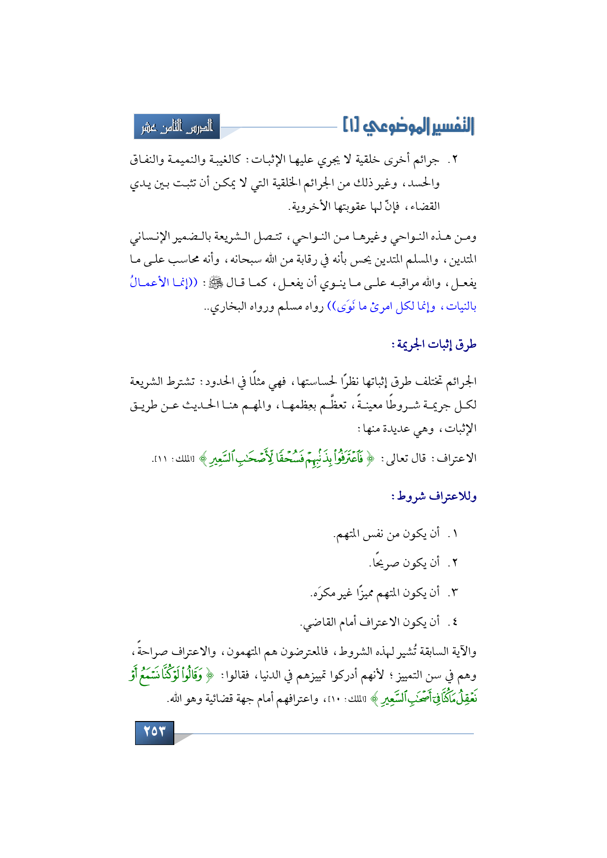 والآية السابقة تُشير لهذه الشروط، فالمعترضون هم المتهمون، والاعتراف صراحةً، وهم في سن التمييز؛ لأنهم أدركوا تمييزهم في الدنيا، فقالوا: {وَقَالُوا لَوْ كُنَّا نَسْمَعُ أَوْ نَعْقِلُ مَا كُنَّا فِي أَصْحَابِ السَّعِيرِ} (الملك: 10)، واعترافهم أمام جهة قضائية وهو الله.