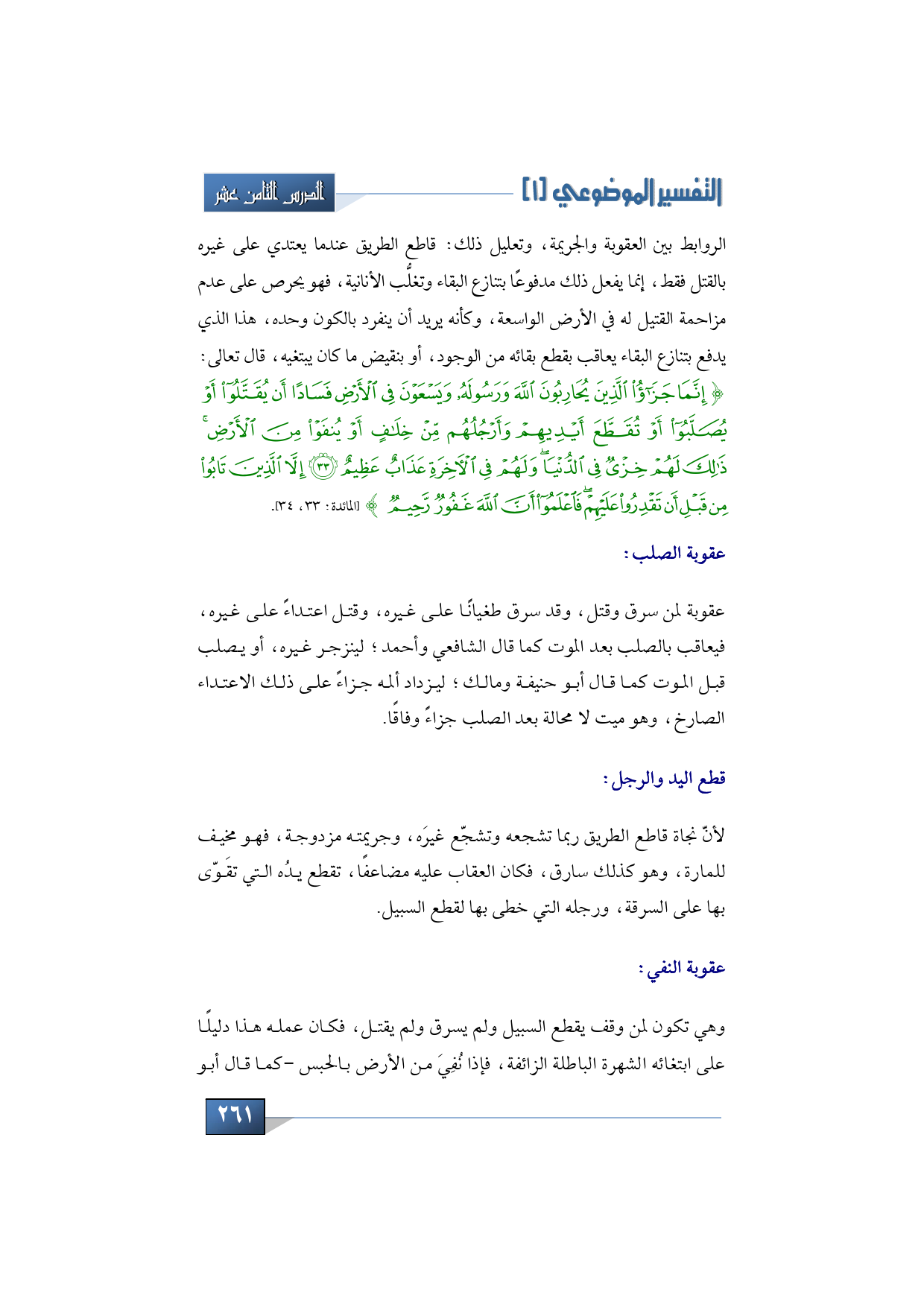 قاطع الطريق عندما يعتدي على غيره بالقتل فقط، إنما يفعل ذلك مدفوعًا بتنازع البقاء وتغلُّب الأنانية، فهو يحرص على عدم مزاحمة القتيل له في الأرض الواسعة، وكأنه يريد أن ينفرد بالكون وحده، هذا الذي يدفع بتنازع البقاء يعاقب بقطع بقائه من الوجود، أو بنقيض ما كان يبتغيه، قال تعالى: {إِنَّمَا جَزَاءُ الَّذِينَ يُحَارِبُونَ اللَّهَ وَرَسُولَهُ وَيَسْعَوْنَ فِي الْأَرْضِ فَسَادًا أَنْ يُقَتَّلُوا أَوْ يُصَلَّبُوا أَوْ تُقَطَّعَ أَيْدِيهِمْ وَأَرْجُلُهُمْ مِنْ خِلَافٍ أَوْ يُنْفَوْا مِنَ الْأَرْضِ ذَلِكَ لَهُمْ خِزْيٌ فِي الدُّنْيَا وَلَهُمْ فِي الْآخِرَةِ عَذَابٌ عَظِيمٌ * إِلّا الَّذِينَ تَابُوا مِنْ قَبْلِ أَنْ تَقْدِرُوا عَلَيْهِمْ فَاعْلَمُوا أَنَّ اللَّهَ غَفُورٌ رَحِيمٌ} (المائدة: 33، 34).