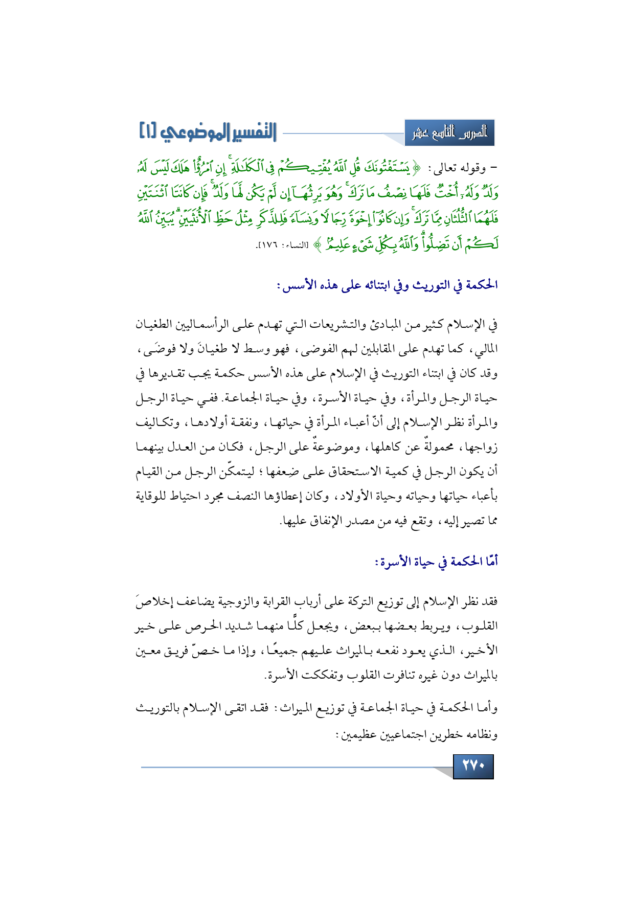 وأما الحكمة في حياة الجماعة في توزيع الميراث: فقد اتقى الإسلام بالتوريث ونظامه خطرين اجتماعيين عظيمين: