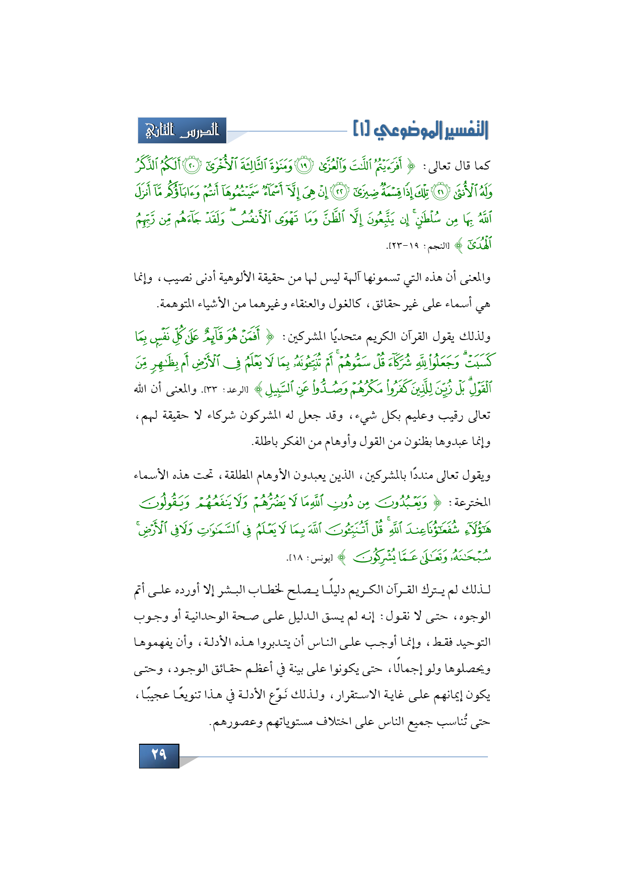 لذلك لم يترك القرآن الكريم دليلًا يصلح لخطاب البشر إلا أورده على أتم الوجوه، حتى لا نقول: إنه لم يسق الدليل على صحة الوحدانية أو وجوب التوحيد فقط، وإنما أوجب على الناس أن يتدبروا هذه الأدلة، وأن يفهموها ويحصلوها ولو إجمالًا، حتى يكونوا على بينة في أعظم حقائق الوجود، وحتى يكون إيمانهم على غاية الاستقرار، ولذلك نَوّع الأدلة في هذا تنويعًا عجيبًا، حتى تُناسب جميع الناس على اختلاف مستوياتهم وعصورهم.