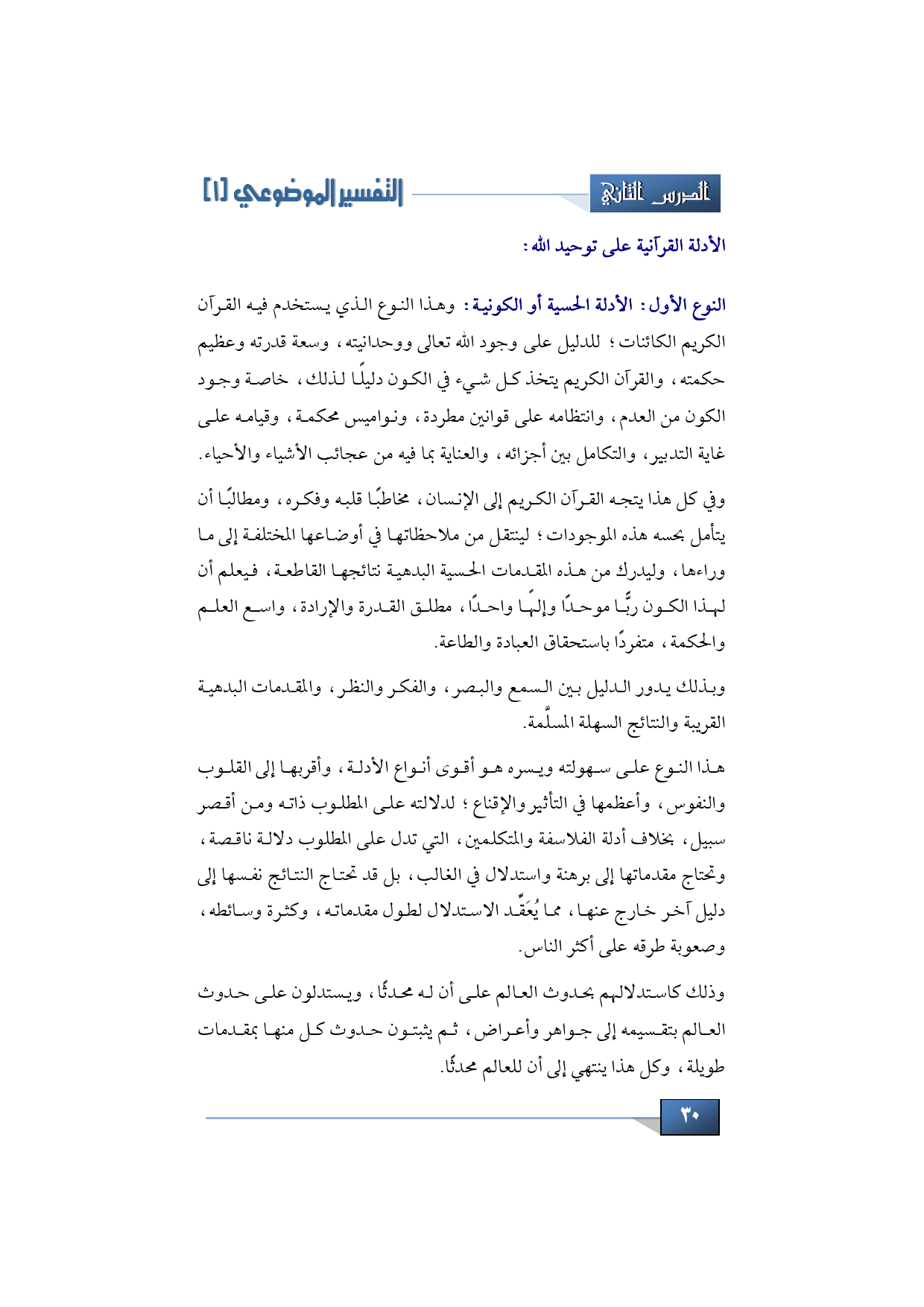 النوع الأول: الأدلة الحسية أو الكونية: وهذا النوع الذي يستخدم فيه القرآن الكريم الكائنات؛ للدليل على وجود الله تعالى ووحدانيته، وسعة قدرته وعظيم حكمته، والقرآن الكريم يتخذ كل شيء في الكون دليلًا لذلك، خاصة وجود الكون من العدم، وانتظامه على قوانين مطردة، ونواميس محكمة، وقيامه على غاية التدبير، والتكامل بين أجزائه، والعناية بما فيه من عجائب الأشياء والأحياء.