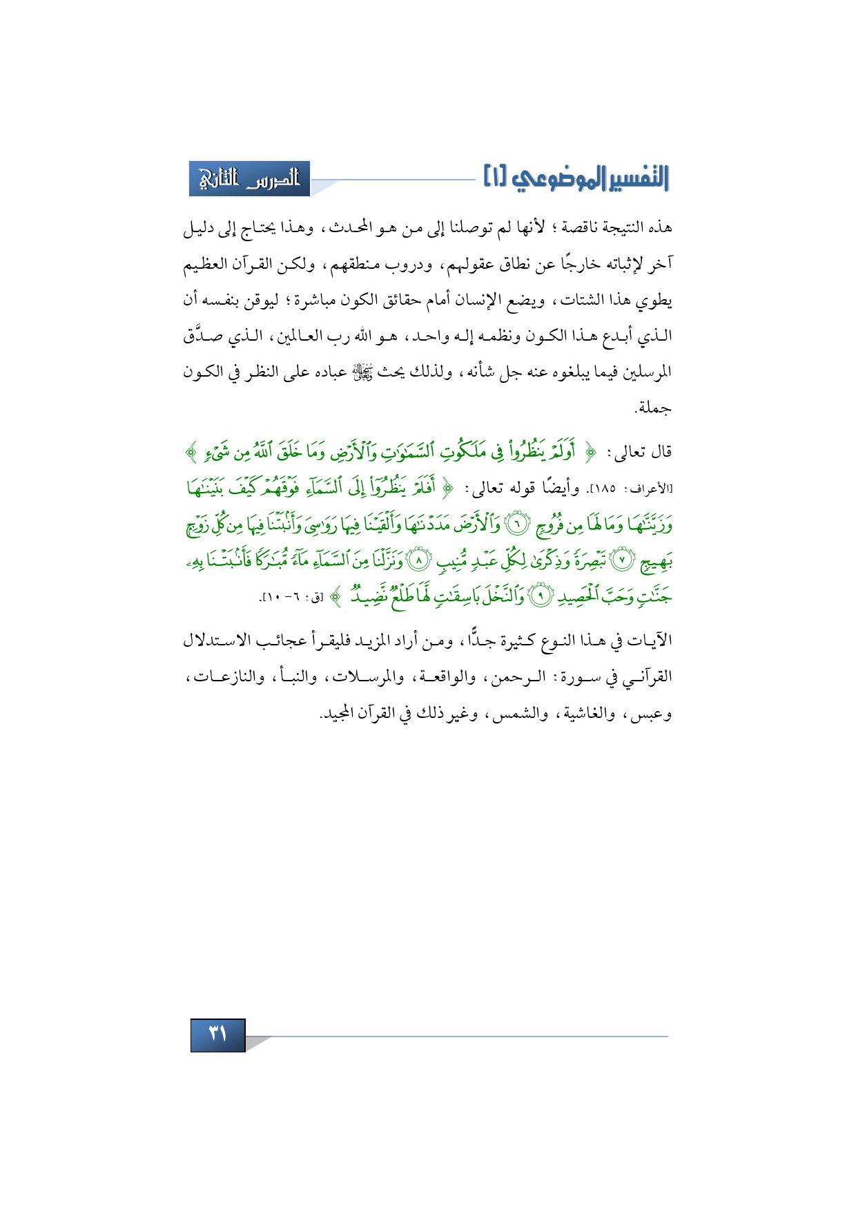 قال تعالى: {أَوَلَمْ يَنْظُرُوا فِي مَلَكُوتِ السَّمَاوَاتِ وَالْأَرْضِ وَمَا خَلَقَ اللَّهُ مِنْ شَيْءٍ} (الأعراف: 185). وأيضًا قوله تعالى: {أَفَلَمْ يَنْظُرُوا إِلَى السَّمَاءِ فَوْقَهُمْ كَيْفَ بَنَيْنَاهَا وَزَيَّنَّاهَا وَمَا لَهَا مِنْ فُرُوجٍ * وَالْأَرْضَ مَدَدْنَاهَا وَأَلْقَيْنَا فِيهَا رَوَاسِيَ وَأَنْبَتْنَا فِيهَا مِنْ كُلِّ زَوْجٍ بَهِيجٍ * تَبْصِرَةً وَذِكْرَى لِكُلِّ عَبْدٍ مُنِيبٍ * وَنَزَّلْنَا مِنَ السَّمَاءِ مَاءً مُبَارَكًا فَأَنْبَتْنَا بِهِ جَنَّاتٍ وَحَبَّ الْحَصِيدِ * وَالنَّخْلَ بَاسِقَاتٍ لَهَا طَلْعٌ نَضِيدٌ} (ق: 6 - 10).