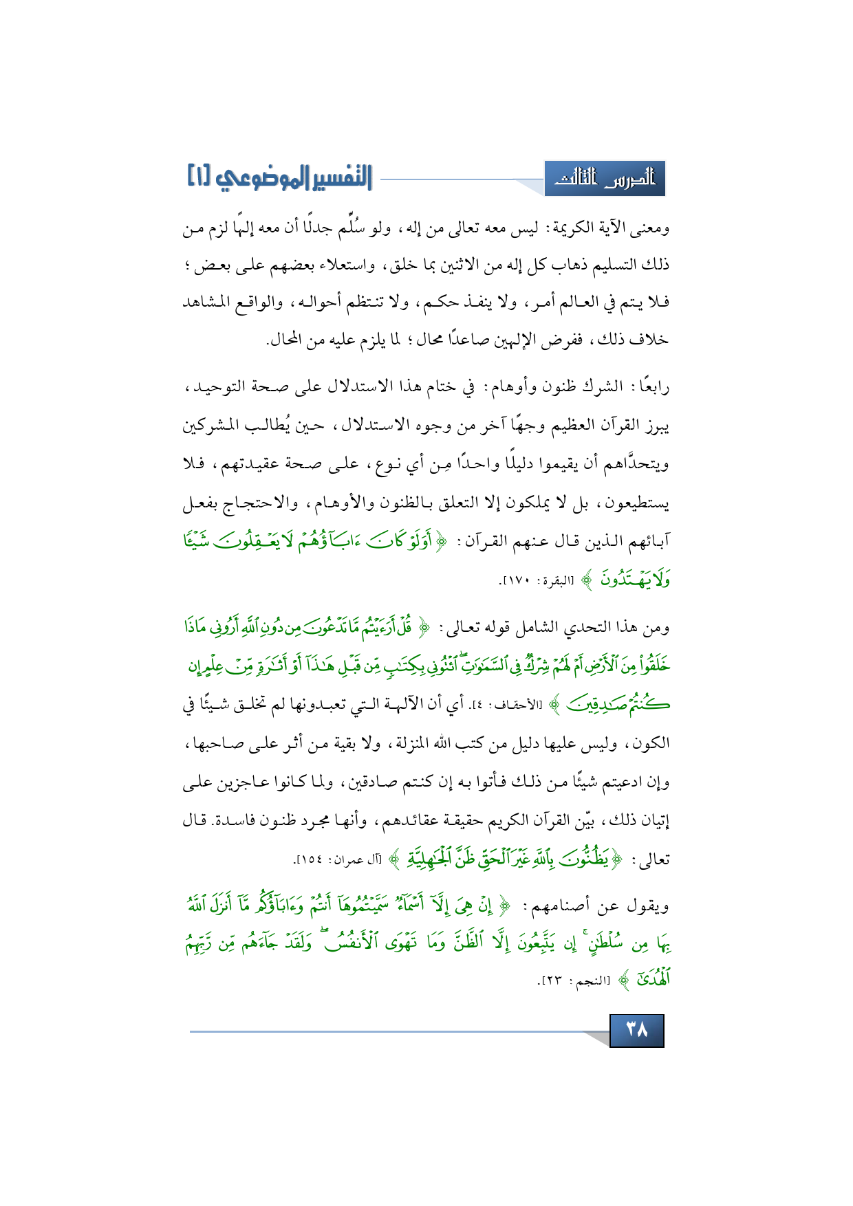 رابعًا: الشرك ظنون وأوهام: في ختام هذا الاستدلال على صحة التوحيد، يبرز القرآن العظيم وجهًا آخر من وجوه الاستدلال، حين يُطالب المشركين ويتحدَّاهم أن يقيموا دليلًا واحدًا مِن أي نوع، على صحة عقيدتهم، فلا يستطيعون، بل لا يملكون إلا التعلق بالظنون والأوهام، والاحتجاج بفعل آبائهم الذين قال عنهم القرآن: {أَوَلَوْ كَانَ آبَاؤُهُمْ لاَ يَعْقِلُونَ شَيْئًا وَلاَ يَهْتَدُون} (البقرة: 170).