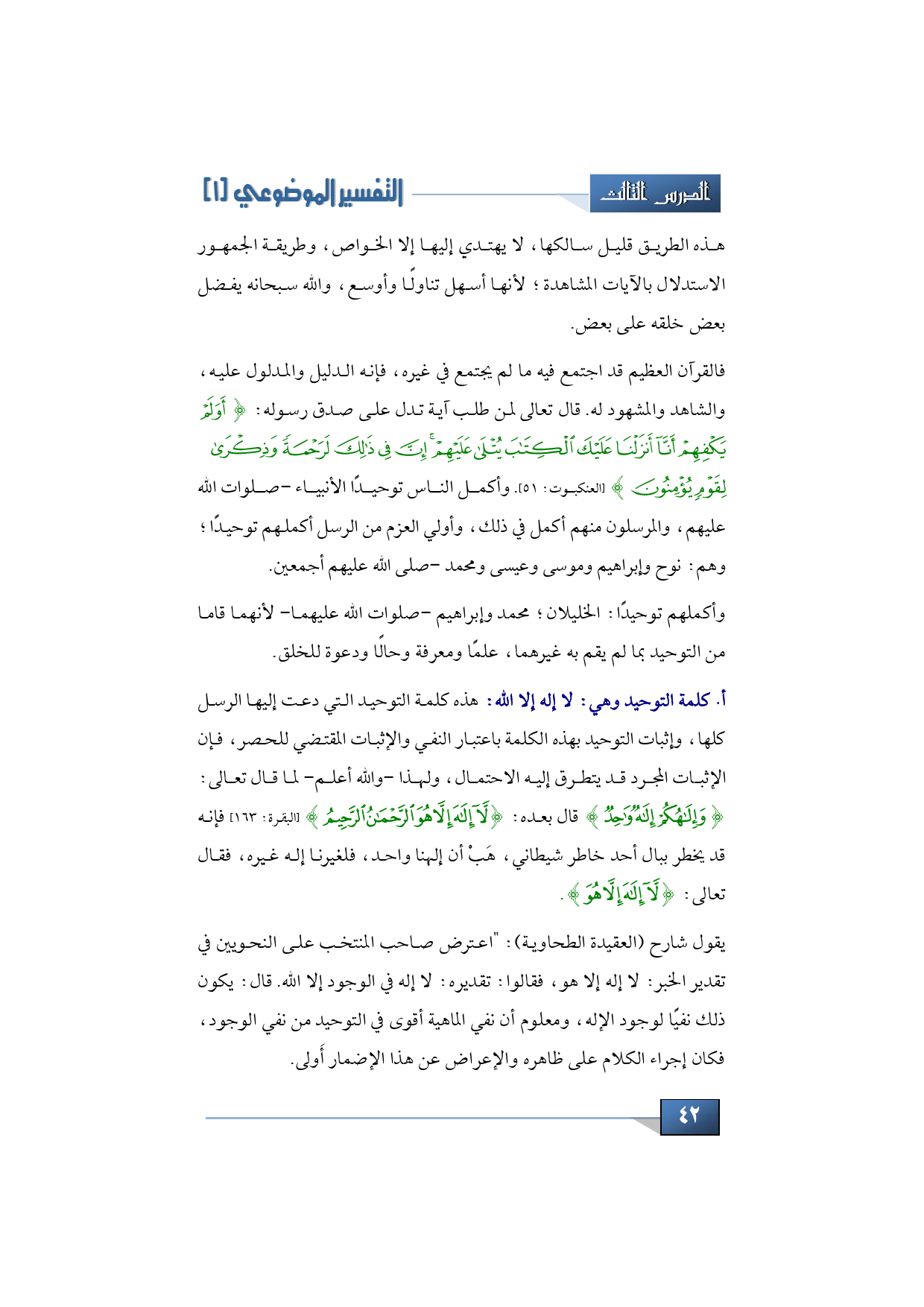فالقرآن العظيم قد اجتمع فيه ما لم يجتمع في غيره، فإنه الدليل والمدلول عليه، والشاهد والمشهود له. قال تعالى لمن طلب آية تدل على صدق رسوله: {أَوَلَمْ يَكْفِهِمْ أَنَّا أَنزَلْنَا عَلَيْكَ الْكِتَابَ يُتْلَى عَلَيْهِمْ إِنَّ فِي ذَلِكَ لَرَحْمَةً وَذِكْرَى لِقَوْمٍ يُؤْمِنُون} (العنكبوت: 51). وأكمل الناس توحيدًا الأنبياء -صلوات الله عليهم، والمرسلون منهم أكمل في ذلك، وأولي العزم من الرسل أكملهم توحيدًا؛ وهم: نوح وإبراهيم وموسى وعيسى ومحمد -صلى الله عليهم أجمعين.