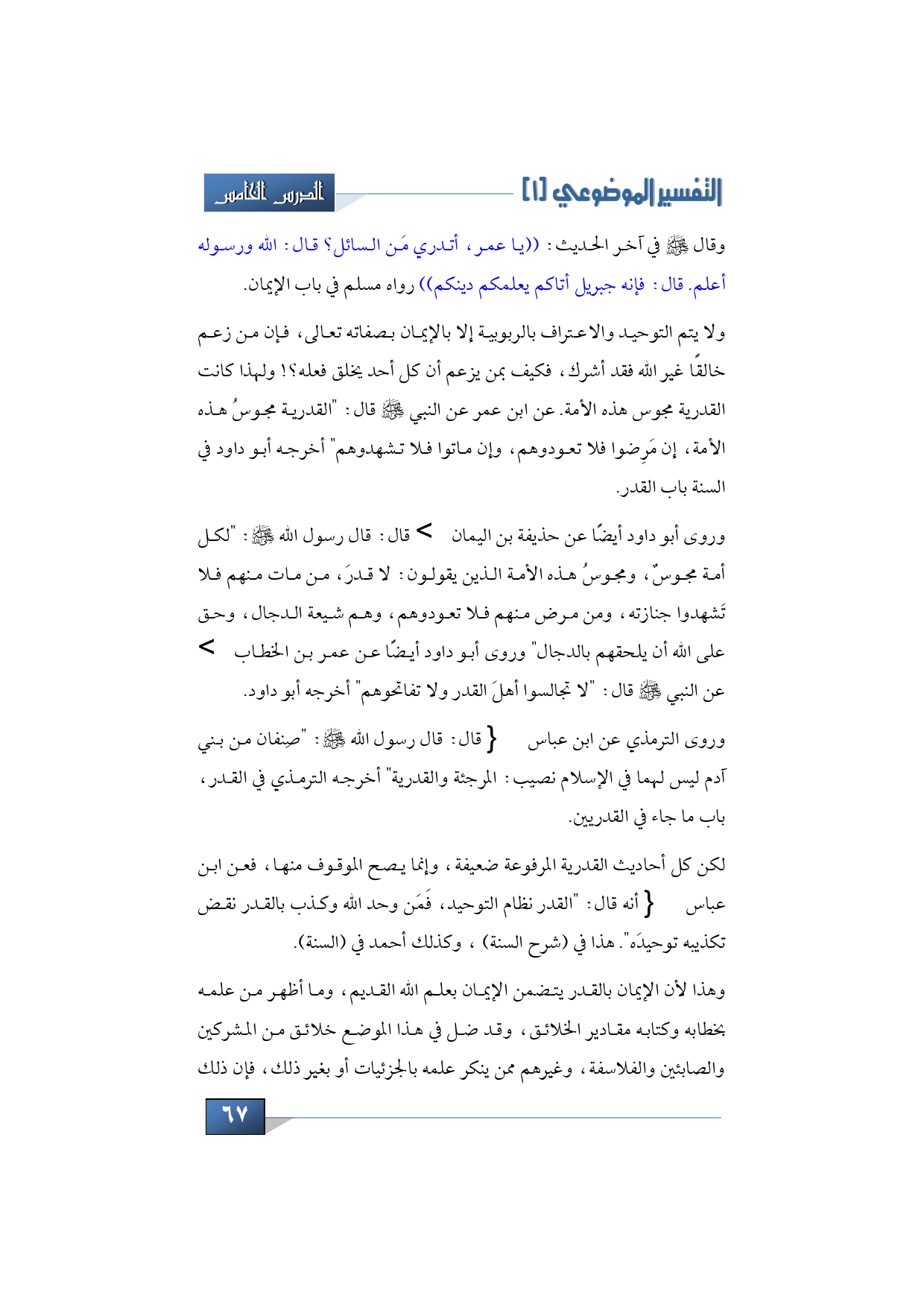 لكن كل أحاديث القدرية المرفوعة ضعيفة، وإنما يصح الموقوف منها، فعن ابن عباس -رضي الله عنهما- أنه قال: "القدر نظام التوحيد، فَمَن وحد الله وكذب بالقدر نقض تكذيبه توحيدَه". هذا في (شرح السنة)، وكذلك أحمد في (السنة).