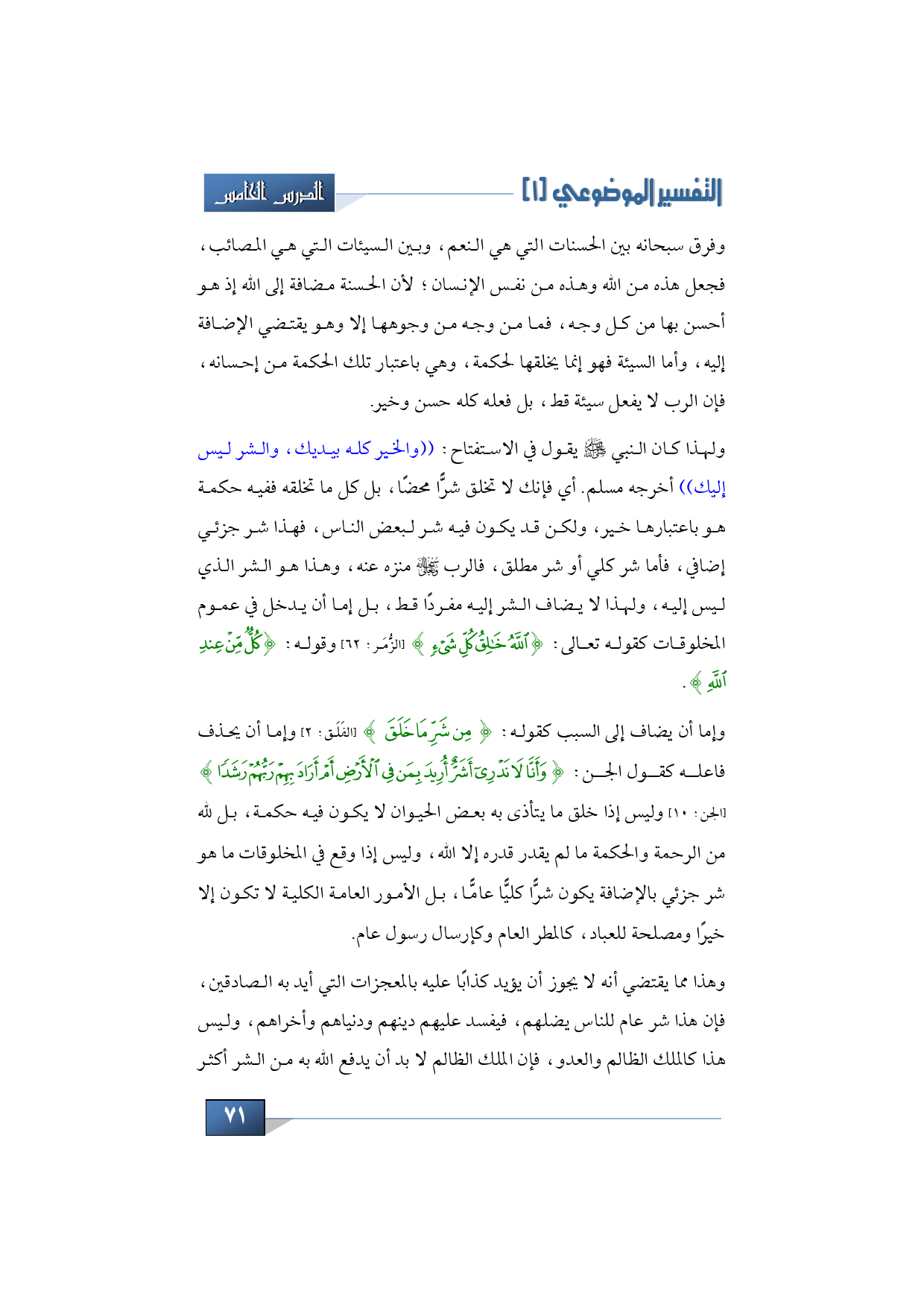 ولهذا كان النبي -صلى الله عليه وسلم- يقول في الاستفتاح: ((والخير كله بيديك، والشر ليس إليك)) أخرجه مسلم. أي فإنك لا تخلق شرًّا محضًا، بل كل ما تخلقه ففيه حكمة هو باعتبارها خير، ولكن قد يكون فيه شر لبعض الناس، فهذا شر جزئي إضافي، فأما شر كلي أو شر مطلق، فالرب سبحانه وتعالى منزه عنه، وهذا هو الشر الذي ليس إليه، ولهذا لا يضاف الشر إليه مفردًا قط، بل إما أن يدخل في عموم المخلوقات كقوله تعالى: {اللَّهُ خَالِقُ كُلِّ شَيْءٍ} (الزُّمَر: 62) وقوله: {كُلًّ مِّنْ عِندِ اللهِ}.