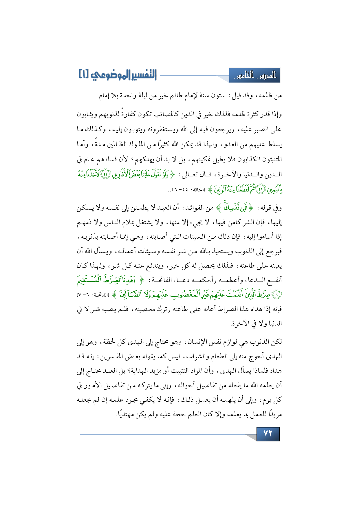 لكن الذنوب هي لوازم نفس الإنسان، وهو محتاج إلى الهدى كل لحظة، وهو إلى الهدى أحوج منه إلى الطعام والشراب، ليس كما يقوله بعض المفسرين: إنه قد هداه فلماذا يسأل الهدى، وأن المراد التثبيت أو مزيد الهداية؟ بل العبد محتاج إلى أن يعلمه الله ما يفعله من تفاصيل أحواله، وإلى ما يتركه من تفاصيل الأمور في كل يوم، وإلى أن يلهمه أن يعمل ذلك، فإنه لا يكفي مجرد علمه إن لم يجعله مريدًا للعمل بما يعلمه وإلا كان العلم حجة عليه ولم يكن مهتديًا.