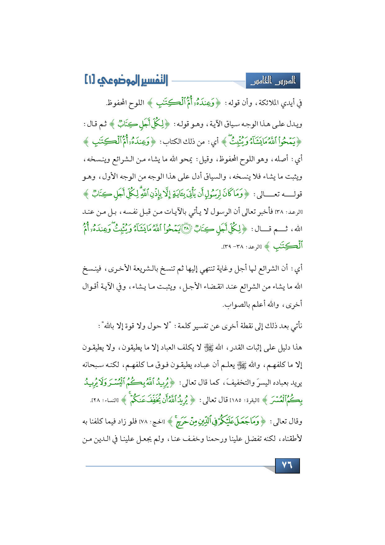 ويدل على هذا الوجه سياق الآية، وهو قوله: {لِكُلِّ أَجَلٍ كِتَاب} ثم قال: {يَمْحُو اللهُ مَا يَشَاء وَيُثْبِتُ} أي: من ذلك الكتاب: {وَعِندَهُ أُمُّ الْكِتَاب} أي: أصله، وهو اللوح المحفوظ، وقيل: يمحو الله ما يشاء من الشرائع وينسخه، ويثبت ما يشاء فلا ينسخه، والسياق أدل على هذا الوجه من الوجه الأول، وهو قوله تعالى: {وَمَا كَانَ لِرَسُولٍ أَن يَأْتِيَ بِآيَةٍ إلَّا بِإِذْنِ اللهِ لِكُلِّ أَجَلٍ كِتَاب} (الرعد: 38) فأخبر تعالى أن الرسول لا يأتي بالآيات من قبل نفسه، بل من عند الله، ثم قال: {لِكُلِّ أَجَلٍ كِتَاب * يَمْحُو اللهُ مَا يَشَاء وَيُثْبِتُ} (الرعد: 38 - 39).