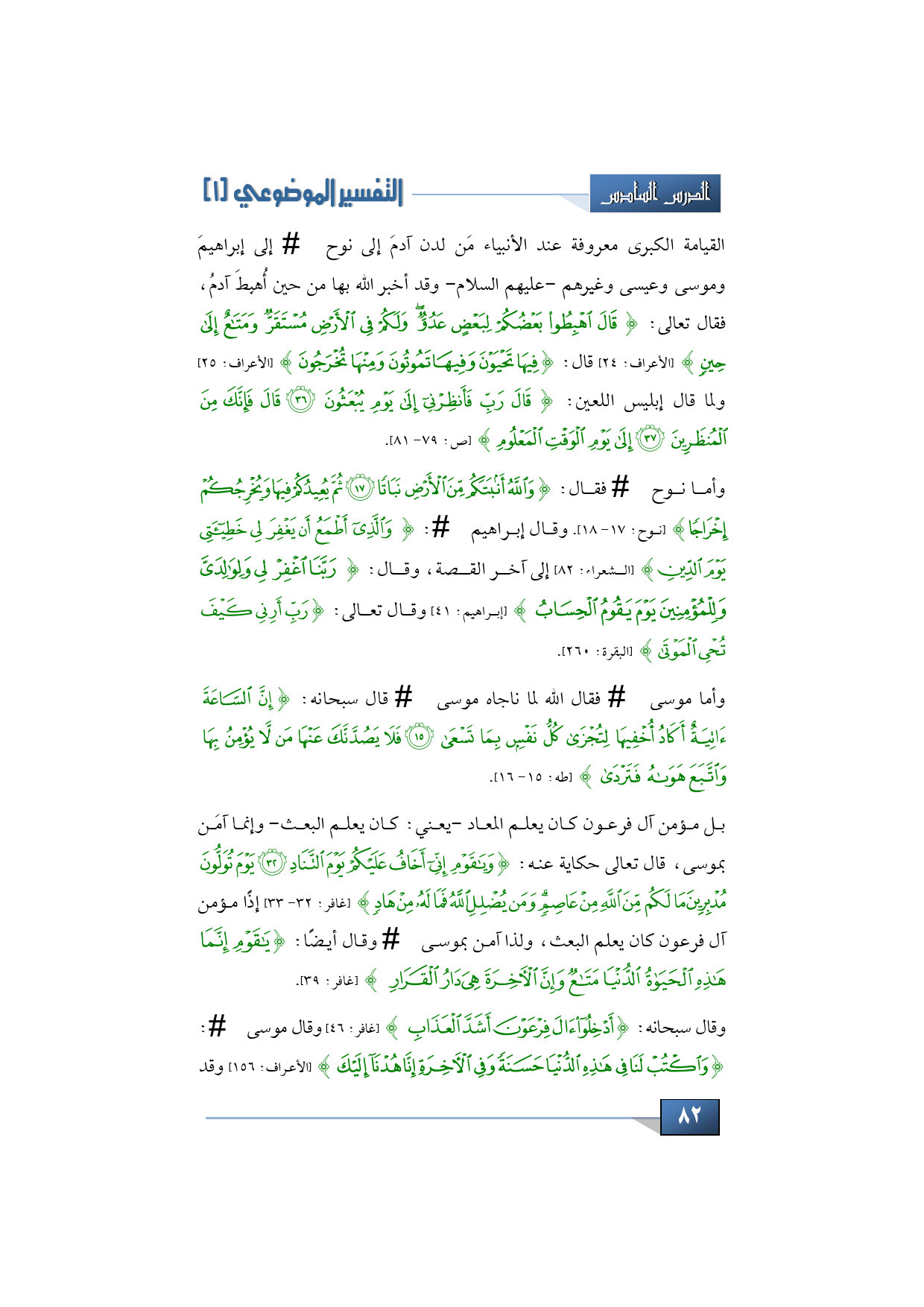 وأما نوح -عليه السلام- فقال: {وَاللَّهُ أَنبَتَكُم مِّنَ الأَرْضِ نَبَاتًا * ثُمَّ يُعِيدُكُمْ فِيهَا وَيُخْرِجُكُمْ إِخْرَاجًا} (نوح: 17 - 18). وقال إبراهيم -عليه السلام-: {وَالَّذِي أَطْمَعُ أَن يَغْفِرَ لِي خَطِيئَتِي يَوْمَ الدِّين} (الشعراء: 82) إلى آخر القصة، وقال: {رَبَّنَا اغْفِرْ لِي وَلِوَالِدَيَّ وَلِلْمُؤْمِنِينَ يَوْمَ يَقُومُ الْحِسَاب} (إبراهيم: 41) وقال تعالى: {رَبِّ أَرِنِي كَيْفَ تُحْيِي الْمَوْتَى} (البقرة: 260).