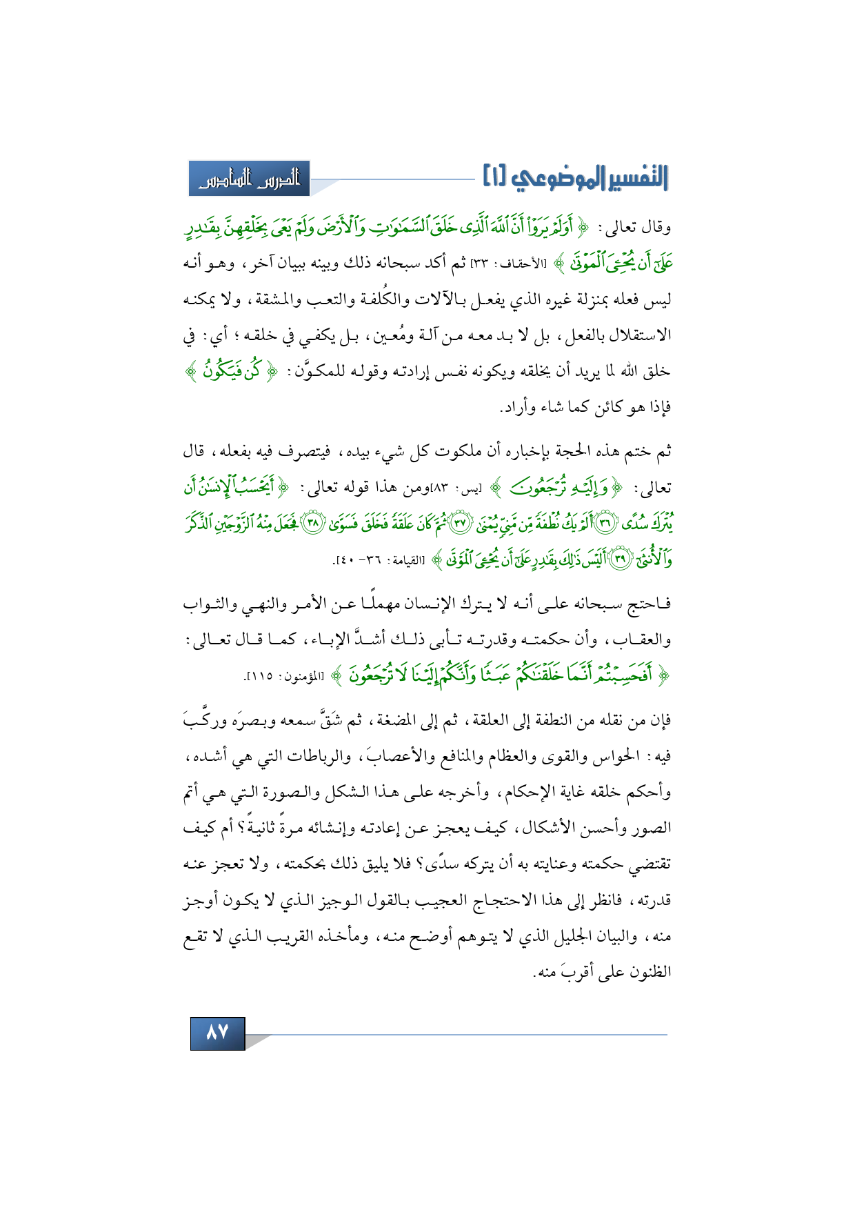 وقال تعالى: {أَوَلَمْ يَرَوْا أَنَّ اللَّهَ الَّذِي خَلَقَ السَّمَاوَاتِ وَالأَرْضَ وَلَمْ يَعْيَ بِخَلْقِهِنَّ بِقَادِرٍ عَلَى أَنْ يُحْيِيَ الْمَوْتَى} (الأحقاف: 33) ثم أكد سبحانه ذلك وبينه ببيان آخر، وهو أنه ليس فعله بمنزلة غيره الذي يفعل بالآلات والكُلفة والتعب والمشقة، ولا يمكنه الاستقلال بالفعل، بل لا بد معه من آلة ومُعين، بل يكفي في خلقه؛ أي: في خلق الله لما يريد أن يخلقه ويكونه نفس إرادته وقوله للمكوَّن: {كُن فَيَكُونُ} فإذا هو كائن كما شاء وأراد.