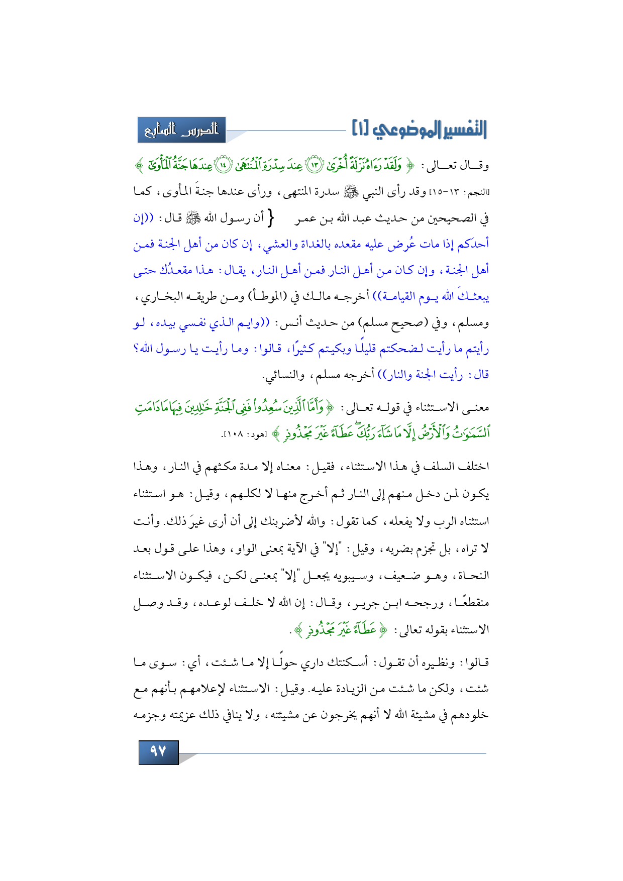 وقال تعالى: {وَلَقَدْ رَآهُ نَزْلَةً أُخْرَى * عِندَ سِدْرَةِ الْمُنْتَهَى * عِندَهَا جَنَّةُ الْمَأْوَى} (النجم: 13 - 15) وقد رأى النبي -صلى الله عليه وسلم- سدرة المنتهى، ورأى عندها جنةَ المأوى، كما في الصحيحين من حديث عبد الله بن عمر -رضي الله عنهما- أن رسول الله -صلى الله عليه وسلم- قال: ((إن أحدَكم إذا مات عُرض عليه مقعده بالغداة والعشي، إن كان من أهل الجنة فمن أهل الجنة، وإن كان من أهل النار فمن أهل النار، يقال: هذا مقعدُك حتى يبعثكَ الله يوم القيامة)) أخرجه مالك في (الموطأ) ومن طريقه البخاري، ومسلم، وفي (صحيح مسلم) من حديث أنس: ((وايم الذي نفسي بيده، لو رأيتم ما رأيت لضحكتم قليلًا وبكيتم كثيرًا، قالوا: وما رأيت يا رسول الله؟ قال: رأيت الجنة والنار)) أخرجه مسلم، والنسائي.
