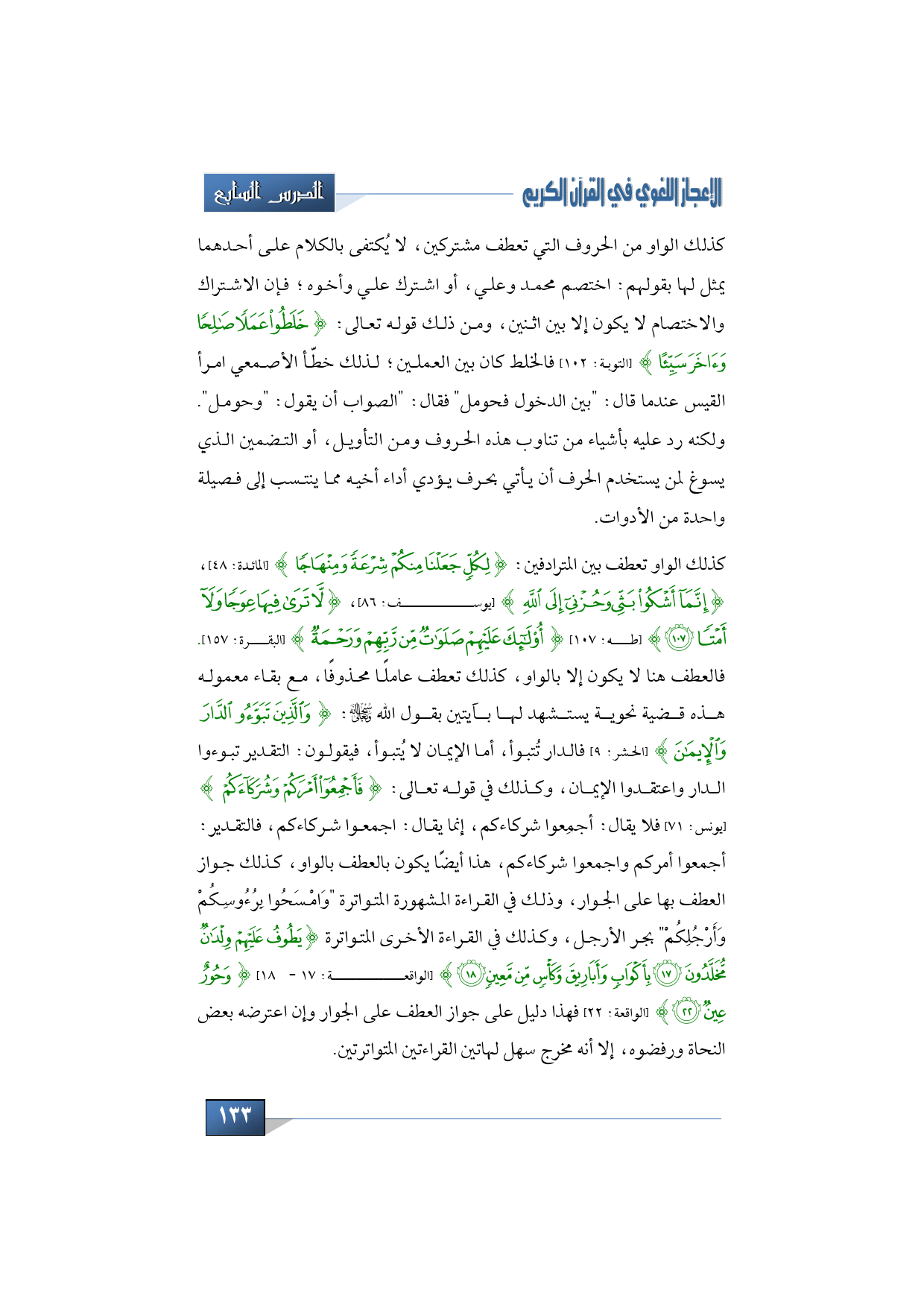 كذلك الواو تعطف بين المترادفين: {لِكُلٍّ جَعَلْنَا مِنْكُمْ شِرْعَةً وَمِنْهَاجًا} (المائدة: 48)، {إِنَّمَا أَشْكُو بَثِّي وَحُزْنِي إِلَى اللَّهِ} (يوسف: 86)، {لَا تَرَى فِيهَا عِوَجًا وَلَا أَمْتًا} (طه: 107) {أُولَئِكَ عَلَيْهِمْ صَلَوَاتٌ مِنْ رَبِّهِمْ وَرَحْمَةٌ} (البقرة: 157) فالعطف هنا لا يكون إلا بالواو، كذلك تعطف عاملًا محذوفًا، مع بقاء معموله هذه قضية نحوية يستشهد لها بآيتين بقول الله -سبحانه وتعالى: {وَالَّذِينَ تَبَوَّءُوا الدَّارَ وَالْإِيمَانَ} (الحشر: 9) فالدار تُتبوأ، أما الإيمان لا يُتبوأ، فيقولون: التقدير تبوءوا الدار واعتقدوا الإيمان، وكذلك في قوله تعالى: {فَأَجْمِعُوا أَمْرَكُمْ وَشُرَكَاءَكُمْ} (يونس: 71) فلا يقال: أجمِعوا شركاءكم، إنما يقال: اجمعوا شركاءكم، فالتقدير: أجمعوا أمركم واجمعوا شركاءكم، هذا أيضا يكون بالعطف بالواو، كذلك جواز العطف بها على الجوار، وذلك في القراءة المشهورة المتواترة "وَامْسَحُوا بِرُءُوسِكُمْ وَأَرْجُلِكُمْ" بجر الأرجل، وكذلك في القراءة الأخرى المتواترة {يَطُوفُ عَلَيْهِمْ وِلْدَانٌ مُخَلَّدُونَ * بِأَكْوَابٍ وَأَبَارِيقَ وَكَأْسٍ مِنْ مَعِينٍ} (الواقعة: 18) .... {وَحُورٌ عِينٌ} (الواقعة: 22) فهذا دليل على جواز العطف على الجوار وإن اعترضه بعض النحاة ورفضوه، إلا أنه مخرج سهل لهاتين القراءتين المتواترتين.