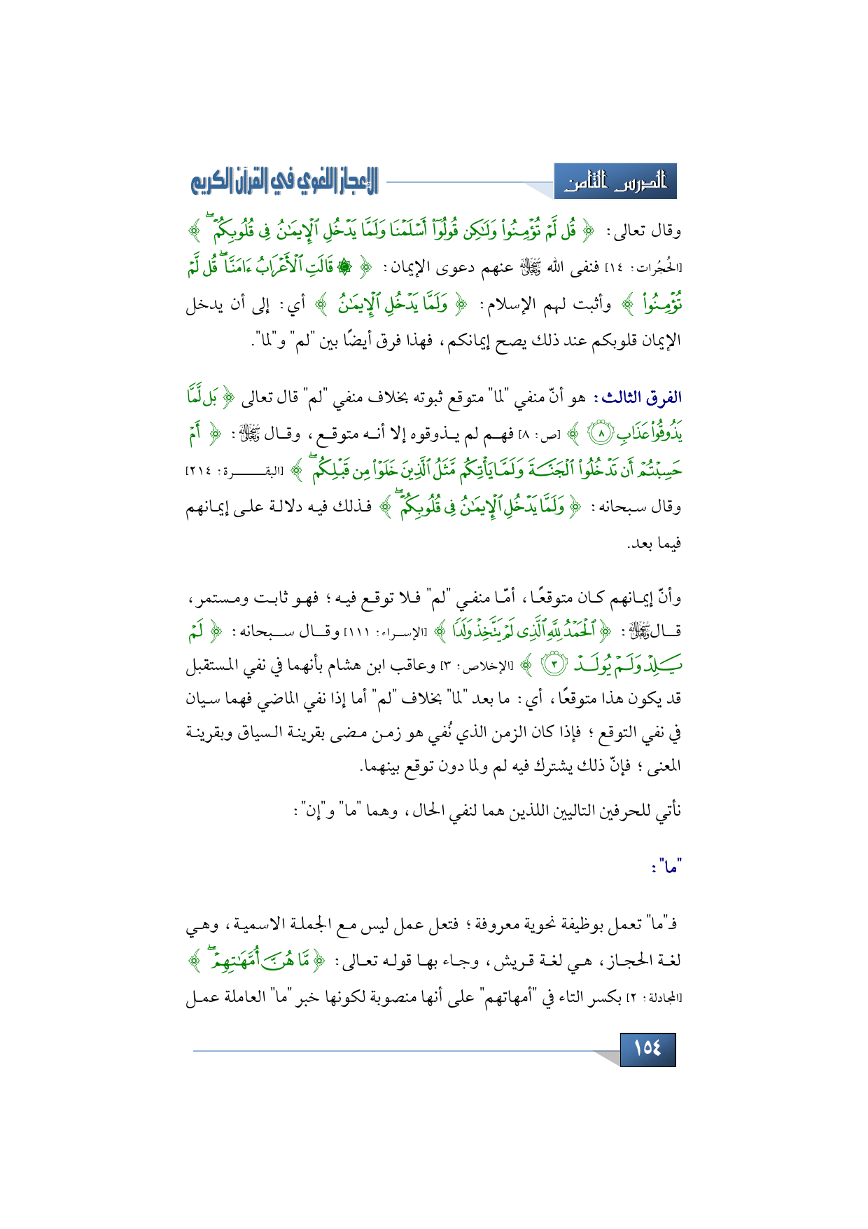 وقال تعالى: {قُل لَّمْ تُؤْمِنُوا وَلَكِن قُولُوا أَسْلَمْنَا وَلَمَّا يَدْخُلِ الإِيمَانُ فِي قُلُوبِكُمْ} (الحُجُرات: 14) فنفى الله -سبحانه وتعالى- عنهم دعوى الإيمان: {قَالَتِ الأَعْرَابُ آمَنَّا قُل لَّمْ تُؤْمِنُوا} وأثبت لهم الإسلام: {وَلَمَّا يَدْخُلِ الإِيمَانُ} أي: إلى أن يدخل الإيمان قلوبكم عند ذلك يصح إيمانكم، فهذا فرق أيضًا بين "لم" و"لما".