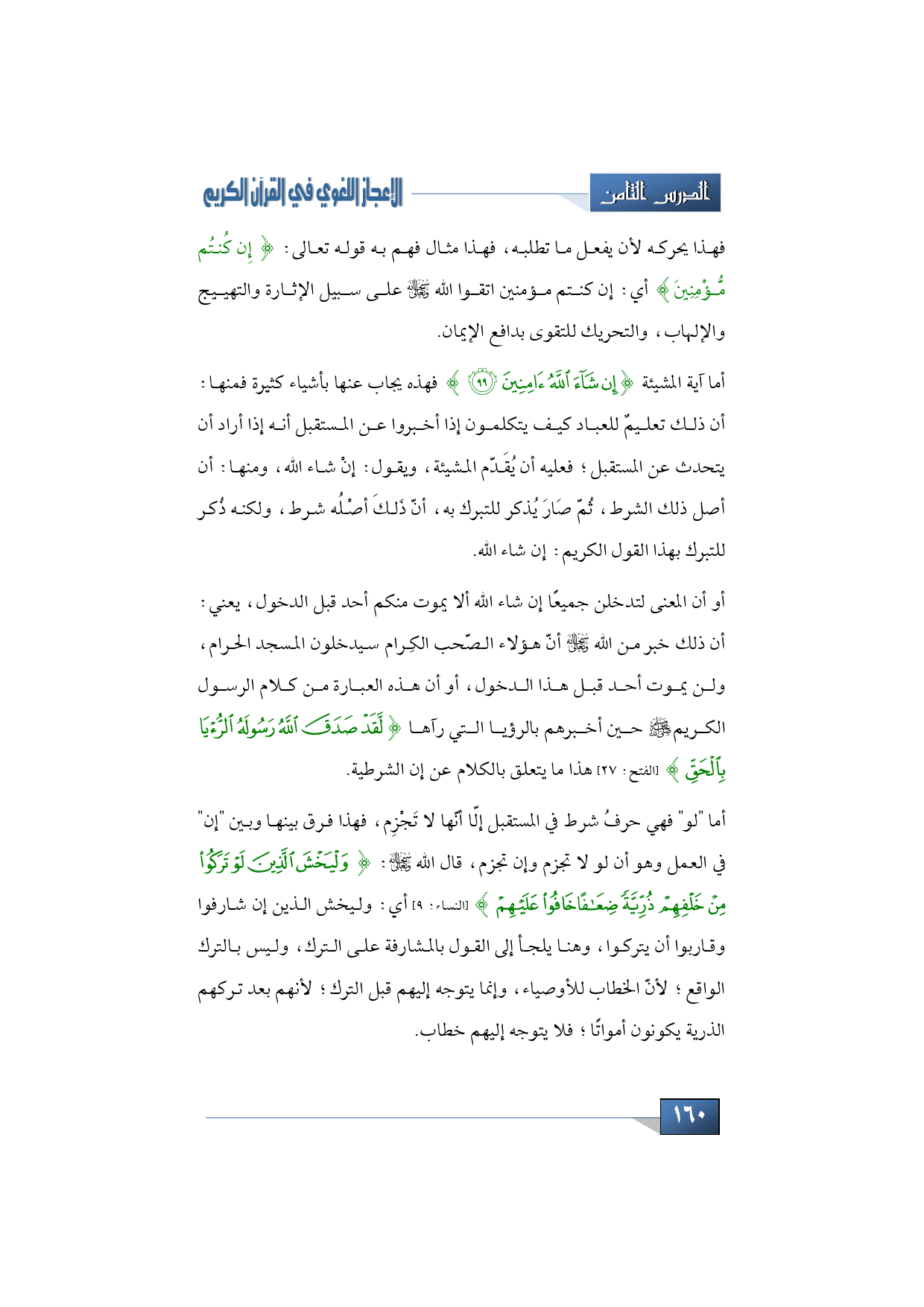 أو أن المعنى لتدخلن جميعًا إن شاء الله ألا يموت منكم أحد قبل الدخول، يعني: أن ذلك خبر من الله -سبحانه وتعالى- أنّ هؤلاء الصّحب الكِرام سيدخلون المسجد الحرام، ولن يموت أحد قبل هذا الدخول، أو أن هذه العبارة من كلام الرسول الكريم -صلى الله عليه وسلم- حين أخبرهم بالرؤيا التي رآها {لَقَدْ صَدَقَ اللَّهُ رَسُولَهُ الرُّؤْيَا بِالْحَقِّ} (الفتح: 27) هذا ما يتعلق بالكلام عن إن الشرطية.