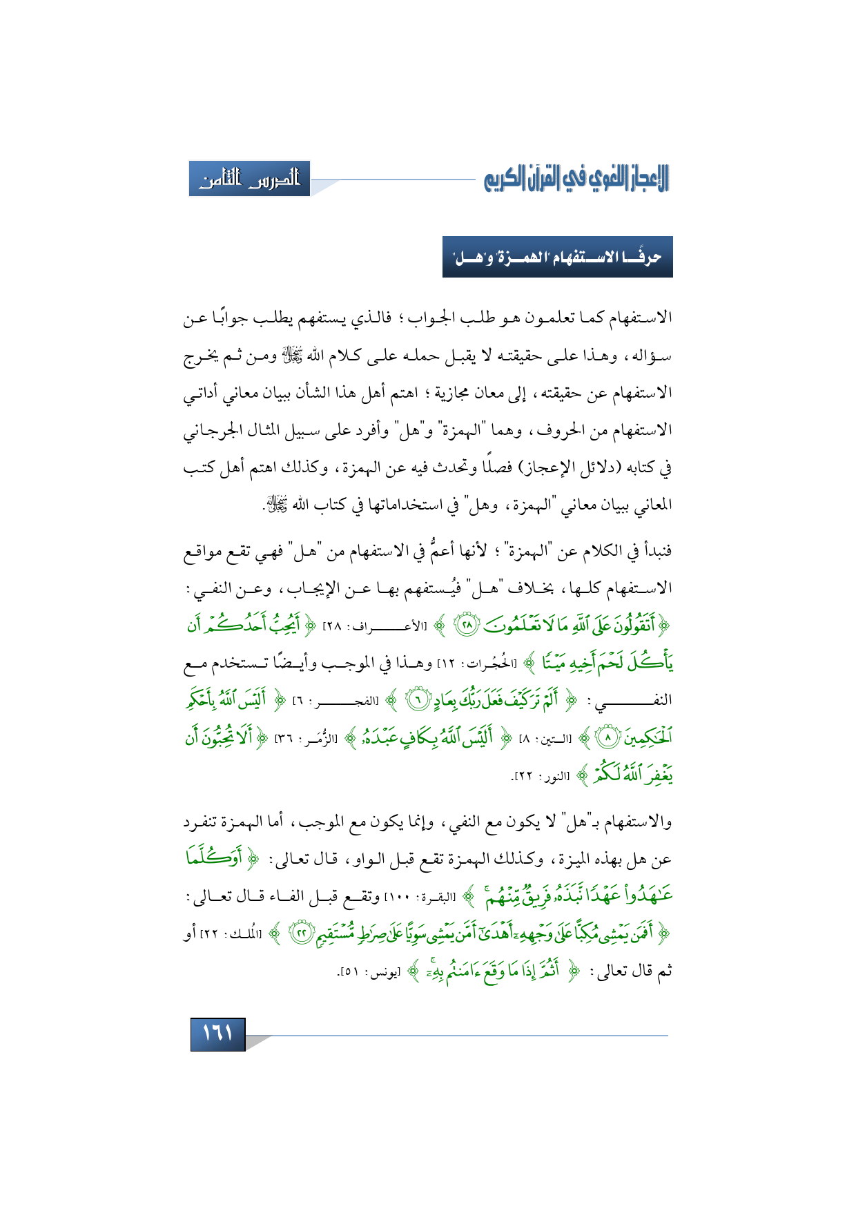 الاستفهام كما تعلمون هو طلب الجواب؛ فالذي يستفهم يطلب جوابًا عن سؤاله، وهذا على حقيقته لا يقبل حمله على كلام الله -سبحانه وتعالى- ومن ثم يخرج الاستفهام عن حقيقته، إلى معان مجازية؛ اهتم أهل هذا الشأن ببيان معاني أداتي الاستفهام من الحروف، وهما "الهمزة" و"هل" وأفرد على سبيل المثال الجرجاني في كتابه (دلائل الإعجاز) فصلًا وتحدث فيه عن الهمزة، وكذلك اهتم أهل كتب المعاني ببيان معاني "الهمزة، وهل" في استخداماتها في كتاب الله سبحانه وتعالى.
