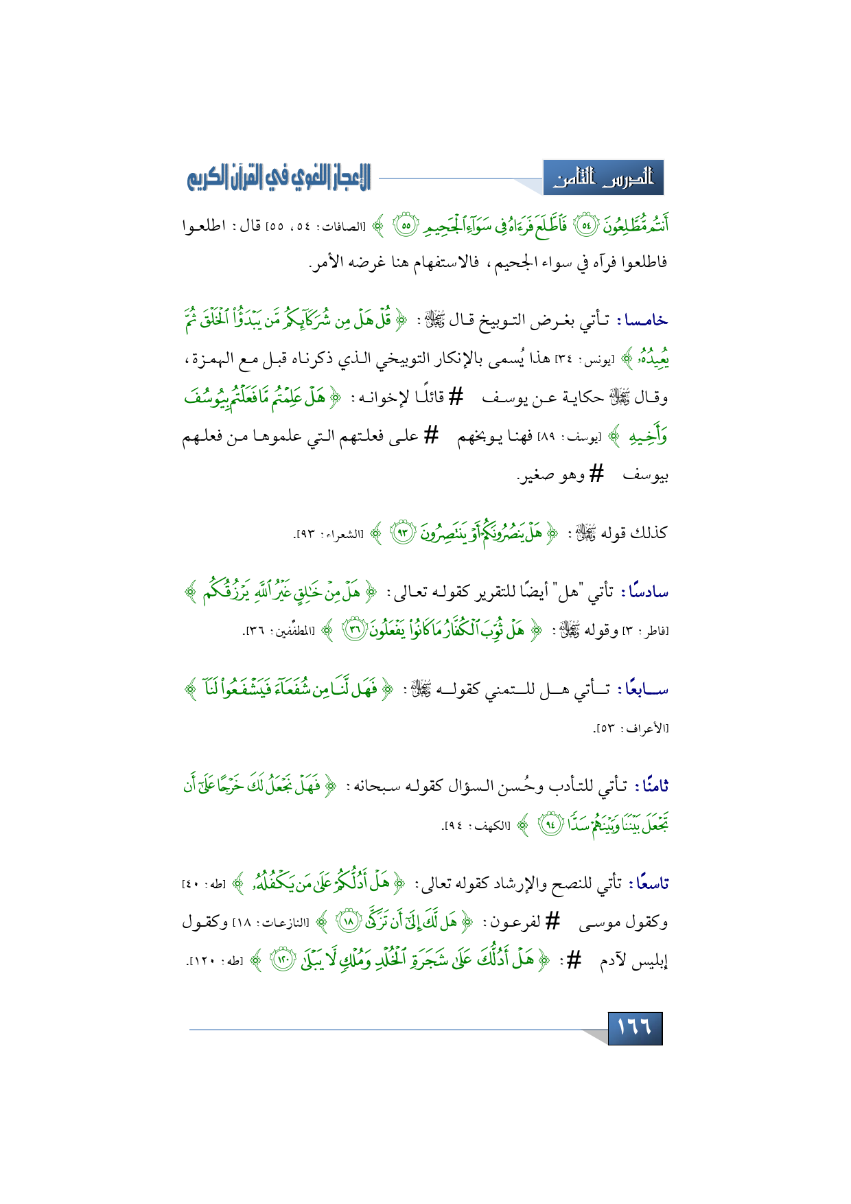 قال: اطلعوا فاطلعوا فرآه في سواء الجحيم، فالاستفهام هنا غرضه الأمر، كذلك تأتي بغرض التوبيخ قال سبحانه وتعالى: {قُلْ هَلْ مِن شُرَكَآئِكُم مَّن يَبْدَأُ الْخَلْقَ ثُمَّ يُعِيدُهُ} (يونس: 34) هذا يُسمى بالإنكار التوبيخي الذي ذكرناه قبل مع الهمزة، وقال سبحانه وتعالى حكاية عن يوسف عليه السلام قائلًا لإخوانه: {هَلْ عَلِمْتُم مَّا فَعَلْتُم بِيُوسُفَ وَأَخِيهِ} (يوسف: 89) فهنا يوبخهم -عليه السلام- على فعلتهم التي علموها من فعلهم بيوسف عليه السلام، وهو صغير.