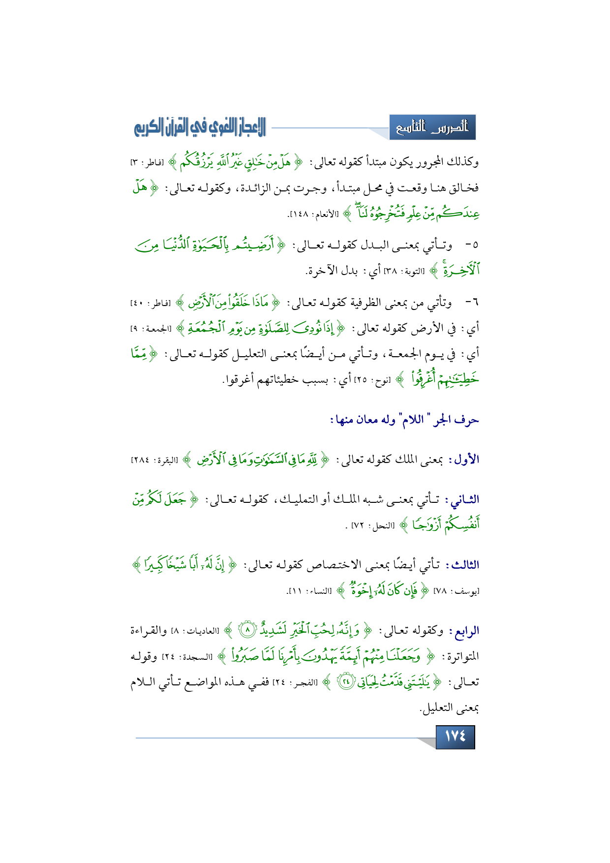 وكقوله تعالى: {وَإِنَّهُ لِحُبِّ الْخَيْرِ لَشَدِيد} (العاديات: 8) والقراءة المتواترة: {وَجَعَلْنَا مِنْهُمْ أَئِمَّةً يَهْدُونَ بِأَمْرِنَا لَمَّا صَبَرُوا} (السجدة: 24) وقوله تعالى: {يَا لَيْتَنِي قَدَّمْتُ لِحَيَاتِي} (الفجر: 24) ففي هذه المواضع تأتي اللام بمعنى التعليل.
