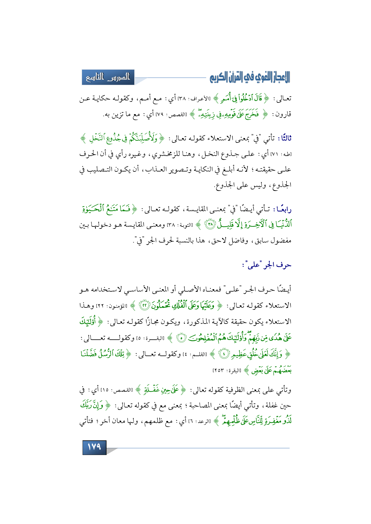 وأيضًا حرف الجر "على" فمعناه الأصلي أو المعنى الأساسي لاستخدامه هو الاستعلاء كقوله تعالى: {وَعَلَيْهَا وَعَلَى الْفُلْكِ تُحْمَلُون} (المؤمنون: 22) وهذا الاستعلاء يكون حقيقة كالآية المذكورة، ويكون مجازًا كقوله تعالى: {أُوْلَئِكَ عَلَى هُدًى مِّن رَّبِّهِمْ وَأُوْلَئِكَ هُمُ الْمُفْلِحُون} (البقرة: 5) وكقوله تعالى: {وَإِنَّكَ لَعَلى خُلُقٍ عَظِيم} (القلم: 4) وكقوله تعالى: {تِلْكَ الرُّسُلُ فَضَّلْنَا بَعْضَهُمْ عَلَى بَعْضٍ} (البقرة: 253).