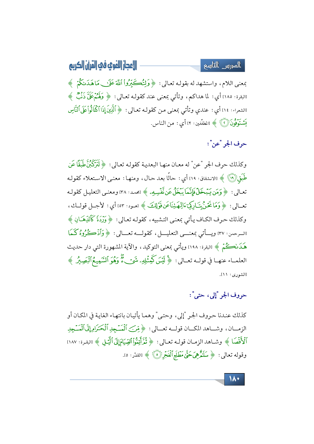 كذلك عندنا حروف الجر "إلى، وحتى" وهما يأتيان بانتهاء الغاية في المكان أو الزمان، وشاهد المكان قوله تعالى: {مِّنَ الْمَسْجِدِ الْحَرَامِ إِلَى الْمَسْجِدِ الأَقْصَى} وشاهد الزمان قوله تعالى: {ثُمَّ أَتِمُّواْ الصِّيَامَ إِلَى الَّليْلِ} (البقرة: 187) وقوله تعالى: {سَلاَمٌ هِيَ حَتَّى مَطْلَعِ الْفَجْر} (القدْر: 5).