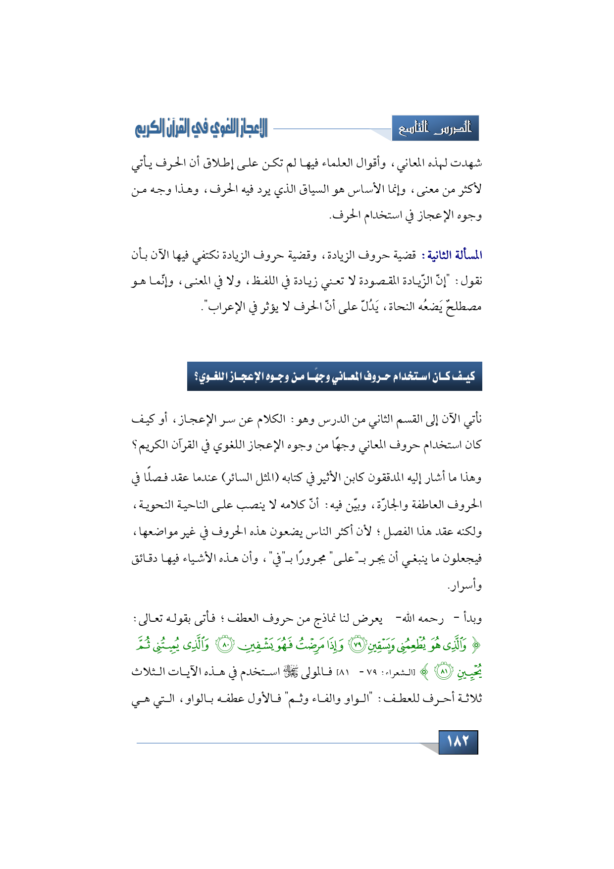 وبدأ -رحمه الله- يعرض لنا نماذج من حروف العطف؛ فأتى بقوله تعالى: {وَالَّذِي هُوَ يُطْعِمُنِي وَيَسْقِين * وَإِذَا مَرِضْتُ فَهُوَ يَشْفِين * وَالَّذِي يُمِيتُنِي ثُمَّ يُحْيِين} (الشعراء: 79 - 81) فالمولى -سبحانه وتعالى- استخدم في هذه الآيات الثلاث ثلاثة أحرف للعطف: "الواو والفاء وثم" فالأول عطفه بالواو، التي هي