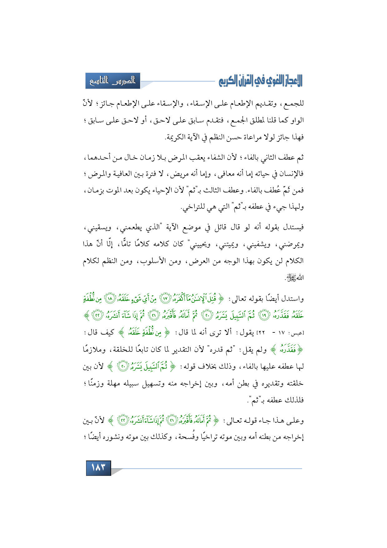 واستدل أيضًا بقوله تعالى: {قُتِلَ الإِنسَانُ مَا أَكْفَرَه * مِنْ أَيِّ شَيْءٍ خَلَقَه * مِن نُّطْفَةٍ خَلَقَهُ فَقَدَّرَه * ثُمَّ السَّبِيلَ يَسَّرَه * ثُمَّ أَمَاتَهُ فَأَقْبَرَه * ثُمَّ إِذَا شَاء أَنشَرَه} (عبس: 17: 22) يقول: ألا ترى أنه لما قال: {مِن نُّطْفَةٍ خَلَقَهُ} كيف قال: {فَقَدَّرَه} ولم يقل: "ثم قدره" لأن التقدير لما كان تابعًا للخلقة، وملازمًا لها عطفه عليها بالفاء، وذلك بخلاف قوله: {ثُمَّ السَّبِيلَ يَسَّرَه} لأن بين خلقته وتقديره في بطن أمه، وبين إخراجه منه وتسهيل سبيله مهلة وزمنًا؛ فلذلك عطفه بـ"ثم".