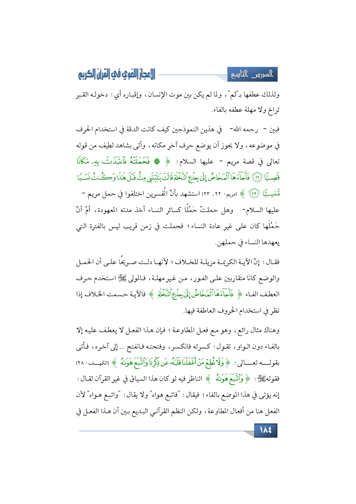 فبين -رحمه الله- في هذين النموذجين كيف كانت الدقة في استخدام الحرف في موضوعه، ولا يجوز أن يوضع حرف آخر مكانه، وأتى بشاهد لطيف من قوله تعالى في قصة مريم -عليها السلام: {فَحَمَلَتْهُ فَانتَبَذَتْ بِهِ مَكَانًا قَصِيًّا * فَأَجَاءهَا الْمَخَاضُ إِلَى جِذْعِ النَّخْلَةِ قَالَتْ يَا لَيْتَنِي مِتُّ قَبْلَ هَذَا وَكُنتُ نَسْيًا مَّنسِيًّا} (مريم: 22 - 23) استشهد بأنّ المُفسرين اختلفوا في حمل مريم -عليها السلام- وهل حملتْ حَمْلًا كسائر النساء أخذ مدته المعهودة، أمْ أنّ حَمْلَها كان على غير عادة النساء؛ فحملت في زمن قريب ليس بالفترة التي يعهدها النساء في حملهن.