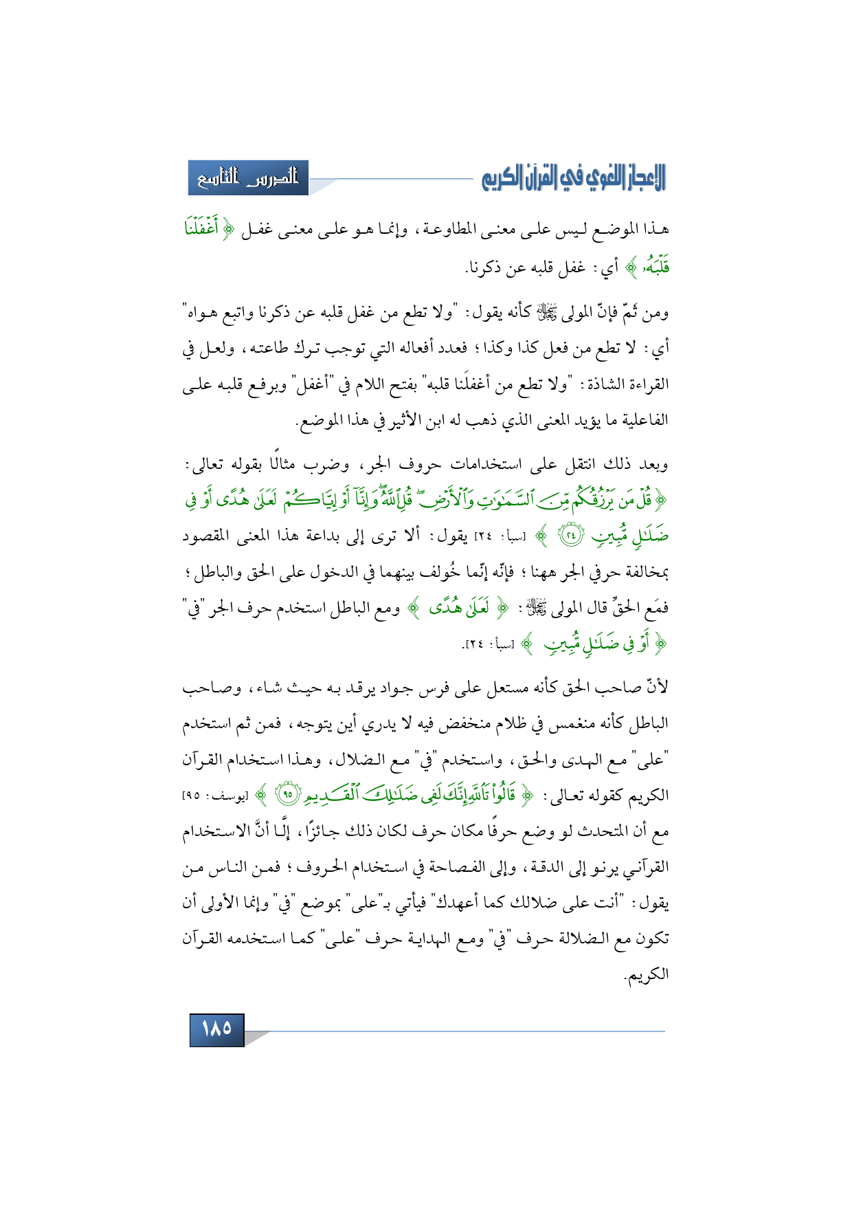 وبعد ذلك انتقل على استخدامات حروف الجر، وضرب مثالًا بقوله تعالى: {قُلْ مَن يَرْزُقُكُم مِّنَ السَّمَاوَاتِ وَالأَرْضِ قُلِ اللَّهُ وَإِنَّا أَوْ إِيَّاكُمْ لَعَلَى هُدًى أَوْ فِي ضَلاَلٍ مُّبِين} (سبأ: 24) يقول: ألا ترى إلى بداعة هذا المعنى المقصود بمخالفة حرفي الجر ها هنا؛ فإنّه إنّما خُولف بينهما في الدخول على الحق والباطل؛ فمَع الحقِّ قال المولى سبحانه وتعالى: {لَعَلَى هُدًى} (الحج: 67) ومع الباطل استخدم حرف الجر "في" {أَوْ فِي ضَلاَلٍ مُّبِين} (سبأ: 24).