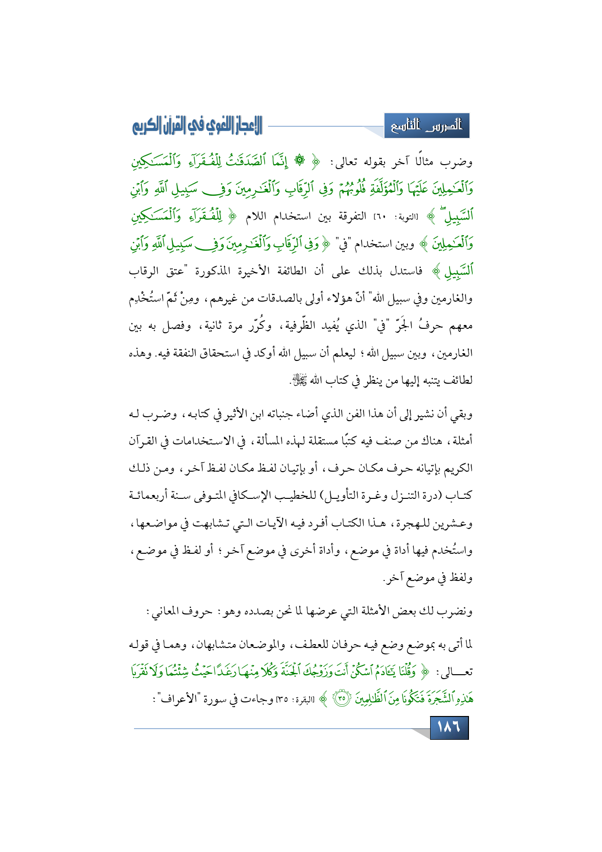 وضرب مثالًا آخر بقوله تعالى: {إِنَّمَا الصَّدَقَاتُ لِلْفُقَرَاء وَالْمَسَاكِينِ وَالْعَامِلِينَ عَلَيْهَا وَالْمُؤَلَّفَةِ قُلُوبُهُمْ وَفِي الرِّقَابِ وَالْغَارِمِينَ وَفِي سَبِيلِ اللهِ وَابْنِ السَّبِيلِ} (التوبة: 60) التفرقة بين استخدام اللام {لِلْفُقَرَاء وَالْمَسَاكِينِ وَالْعَامِلِينَ} وبين استخدام "في" {فِي الرِّقَابِ وَالْغَارِمِينَ وَفِي سَبِيلِ اللهِ وَابْنِ السَّبِيلِ} فاستدل بذلك على أن الطائفة الأخيرة المذكورة "عتق الرقاب والغارمين وفي سبيل الله" أنّ هؤلاء أولى بالصدقات من غيرهم، ومِنْ ثَمّ استُخْدِم معهم حرفُ الجَرّ "في" الذي يُفيد الظّرفية، وكُرّر مرة ثانية، وفصل به بين الغارمين، وبين سبيل الله؛ ليعلم أن سبيل الله أوكد في استحقاق النفقة فيه. وهذه لطائف يتنبه إليها من ينظر في كتاب الله سبحانه وتعالى.