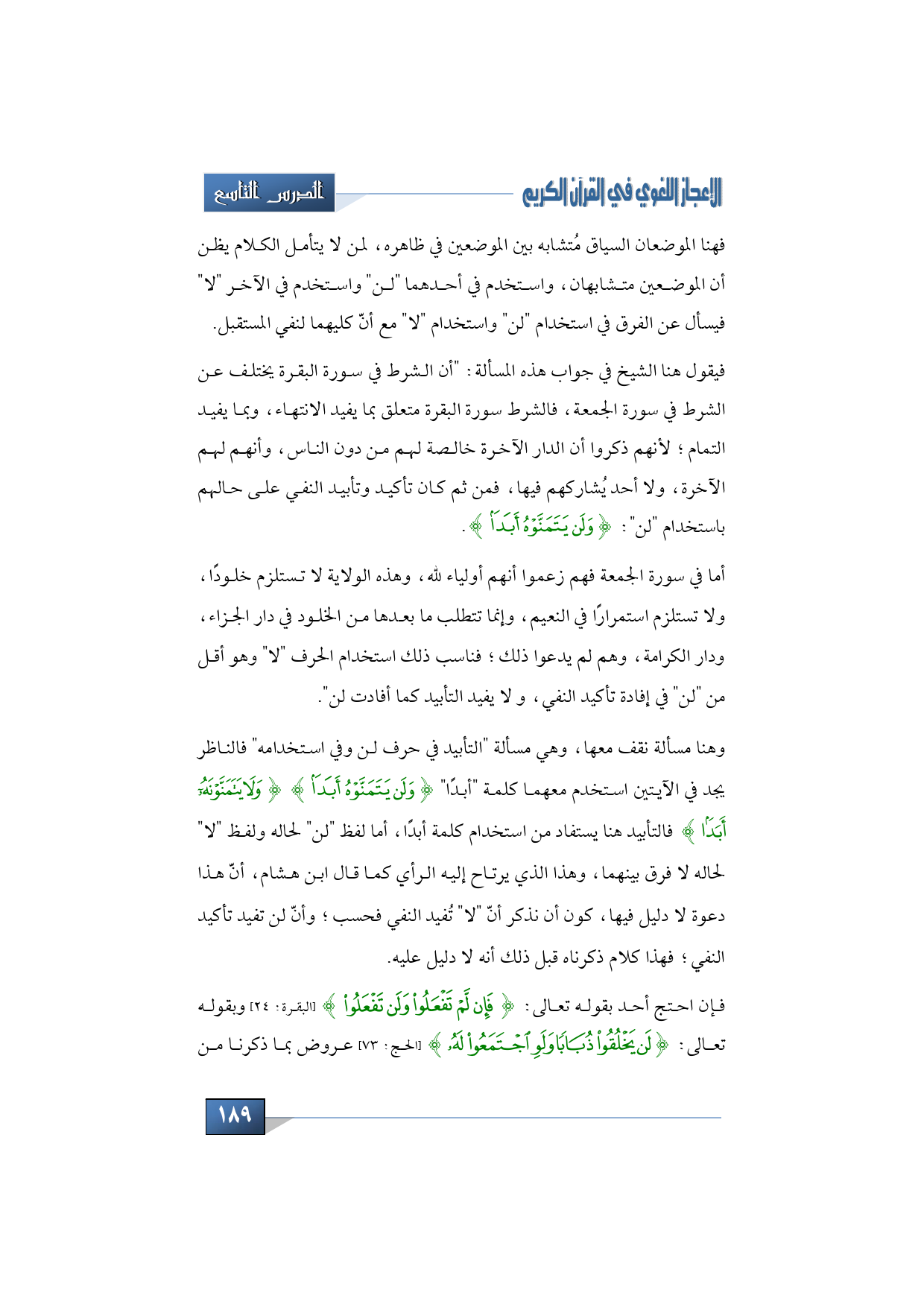 فإن احتج أحد بقوله تعالى: {فَإِن لَّمْ تَفْعَلُواْ وَلَن تَفْعَلُواْ} (البقرة: 24) وبقوله تعالى: {لَن يَخْلُقُوا ذُبَابًا وَلَوِ اجْتَمَعُوا لَهُ} (الحج: 73) عروض بما ذكرنا من