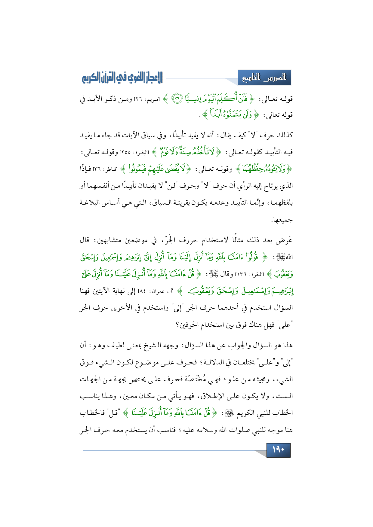 عَرض بعد ذلك مثالًا لاستخدام حروف الجَرّ، أعطينا مثالًا لاستخدام حروف العطف، ومثالًا آخر لاستخدام حروف النفي، ونضرب مثالًا لاستخدام حروف الجر في موضعين متشابهين: قال الله سبحانه وتعالى: {قُولُواْ آمَنَّا بِاللهِ وَمَآ أُنزِلَ إِلَيْنَا وَمَا أُنزِلَ إِلَى إِبْرَاهِيمَ وَإِسْمَاعِيلَ وَإِسْحَقَ وَيَعْقُوبَ} (البقرة: 136) وقال سبحانه وتعالى: {قُلْ آمَنَّا بِاللهِ وَمَا أُنزِلَ عَلَيْنَا وَمَا أُنزِلَ عَلَى إِبْرَاهِيمَ وَإِسْمَاعِيلَ وَإِسْحَقَ وَيَعْقُوبَ} (آل عمران: 84) إلى نهاية الآيتين فهنا السؤال استخدم في أحدهما حرف الجر "إلى" واستخدم في الأخرى حرف الجر "على" فهل هناك فرق بين استخدام الحرفين؟