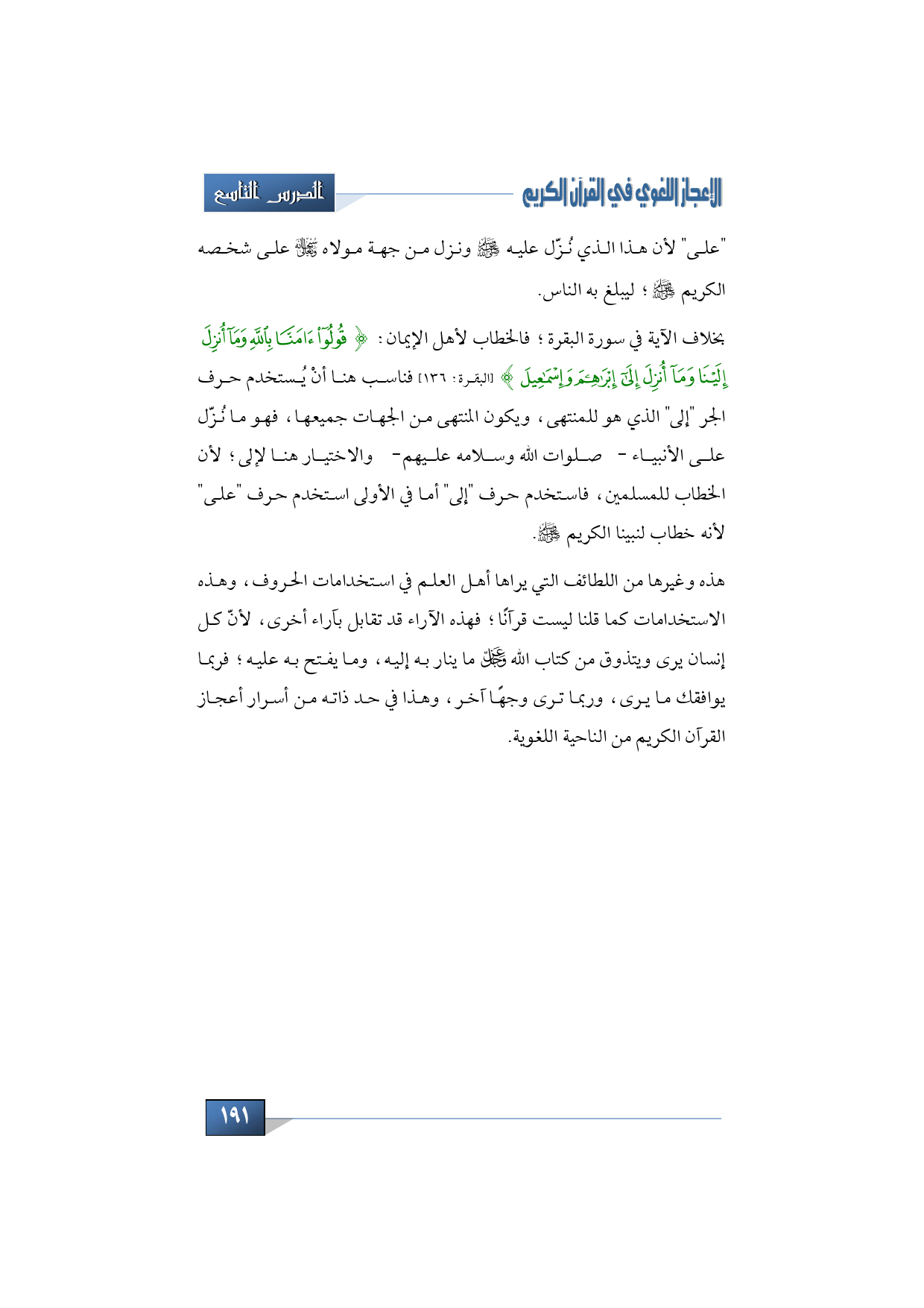 بخلاف الآية في سورة البقرة؛ فالخطاب لأهل الإيمان: {قُولُواْ آمَنَّا بِاللهِ وَمَآ أُنزِلَ إِلَيْنَا وَمَا أُنزِلَ إِلَى إِبْرَاهِيمَ وَإِسْمَاعِيلَ} (البقرة: 136) فناسب هنا أنْ يُستخدم حرف الجر "إلى" الذي هو للمنتهى، ويكون المنتهى من الجهات جميعها، فهو ما نُزّل على الأنبياء -صلوات الله وسلامه عليهم- والاختيار هنا لإلى؛ لأن الخطاب للمسلمين، فاستخدم حرف "إلى" أما في الأولى استخدم حرف "على" لأنه خطاب لنبينا الكريم -صلى الله عليه وآله وصحبه وسلم.