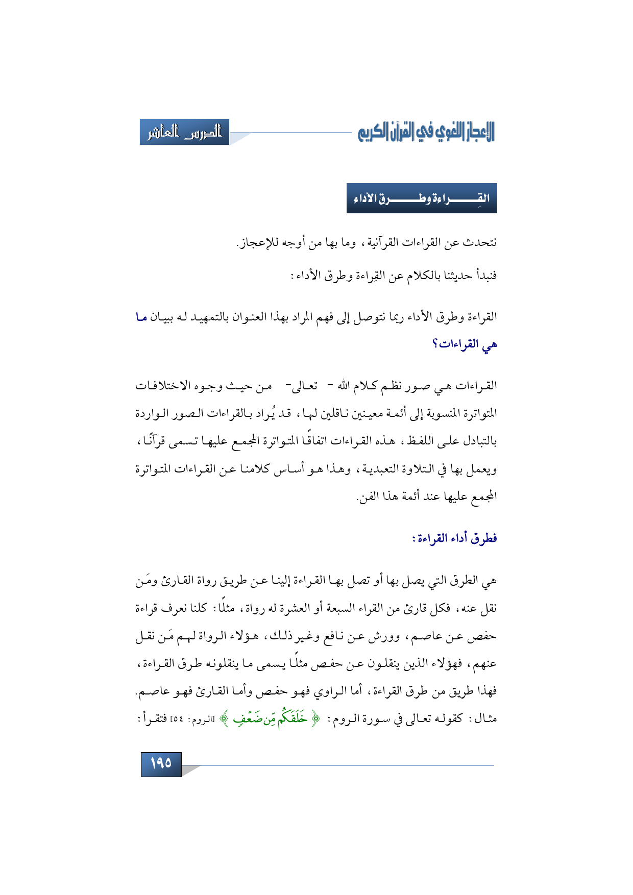 فطرق أداء القراءة: هي الطرق التي يصل بها أو تصل بها القراءة إلينا عن طريق رواة القارئ ومَن نقل عنه، فكل قارئ من القراء السبعة أو العشرة له رواة، مثلًا: كلنا نعرف قراءة حفص عن عاصم وورش عن نافع وغير ذلك، هؤلاء الرواة لهم مَن نقل عنهم، فهؤلاء الذين ينقلون عن حفص مثلًا يسمى ما ينقلونه طرق القراءة، فهذا طريق من طرق القراءة، أما الراوي فهو حفص وأما القارئ فهو عاصم. مثال: كقوله تعالى في سورة الروم: {خَلَقَكُمْ مِنْ ضَعْفٍ} (الروم: 54) فتقرأ: