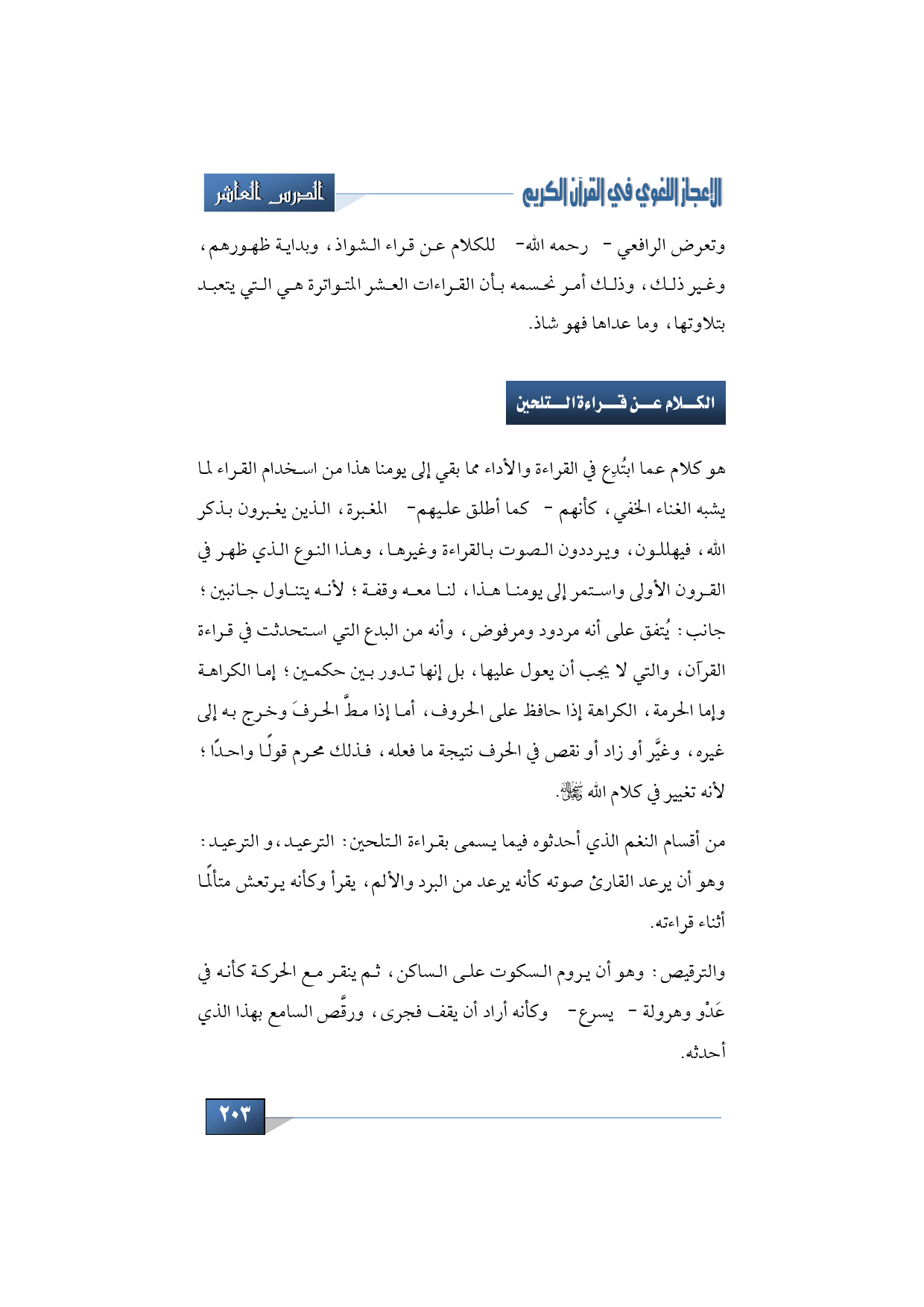 وتعرض الرافعي -رحمه الله- للكلام عن قراء الشواذ، وبداية ظهورهم، وغير ذلك، وذلك أمر نحسمه بأن القراءات العشر المتواترة هي التي يتعبد بتلاوتها، وما عداها فهو شاذ.