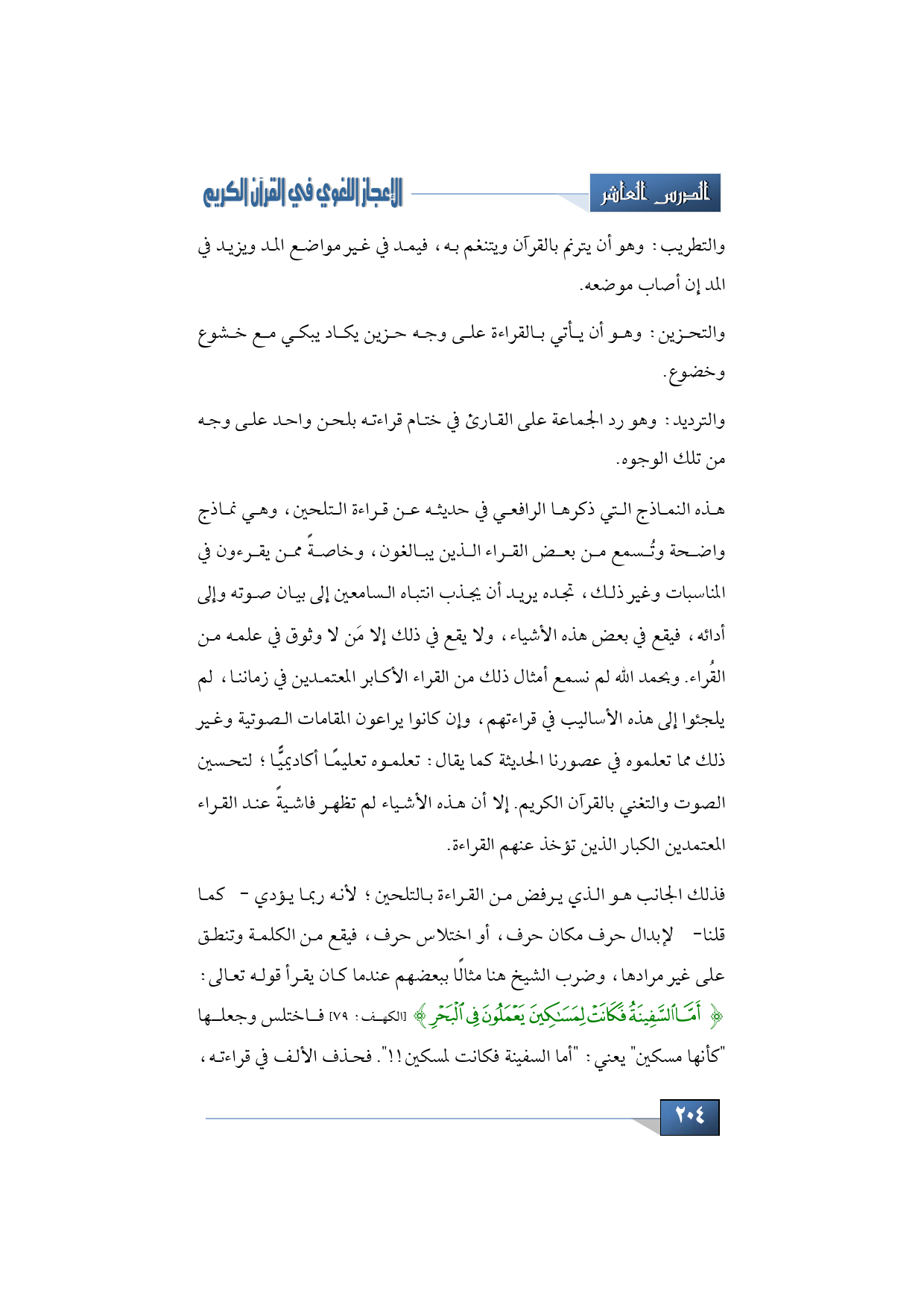فذلك الجانب هو الذي يرفض من القراءة بالتلحين؛ لأنه ربما يؤدي -كما قلنا- لإبدال حرف مكان حرف، أو اختلاس حرف، فيقع من الكلمة وتنطق على غير مرادها، وضرب الشيخ هنا مثالًا ببعضهم عندما كان يقرأ قوله تعالى: {أَمَّا السَّفِينَةُ فَكَانَتْ لِمَسَاكِينَ يَعْمَلُونَ فِي الْبَحْرِ} (الكهف: 79) فاختلس وجعلها "كأنها مسكين" يعني: "أما السفينة فكانت لمسكين لمسكين لمسكين!! ". فحذف الألف في قراءته،