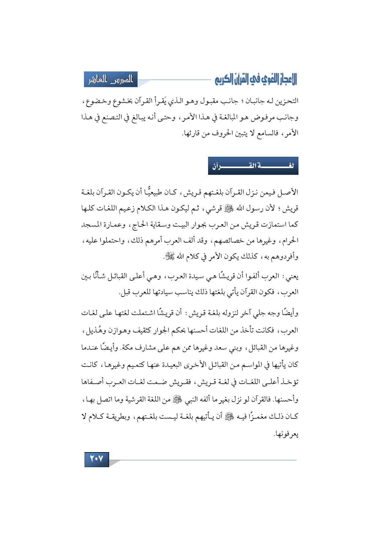 الأصل فيمن نزل القرآن بلغتهم قريش، كان طبيعيًّا أن يكون القرآن بلغة قريش؛ لأن رسول الله -صلى الله عليه وسلم- قرشي، ثم ليكون هذا الكلام زعيم اللغات كلها كما استمازت قريش من العرب بجوار البيت وسقاية الحاج وعمارة المسجد الحرام، وغيرها من خصائصهم، وقد ألف العرب أمرهم ذلك، واحتملوا عليه، وأفردوهم به، كذلك يكون الأمر في كلام الله -سبحانه وتعالى-.