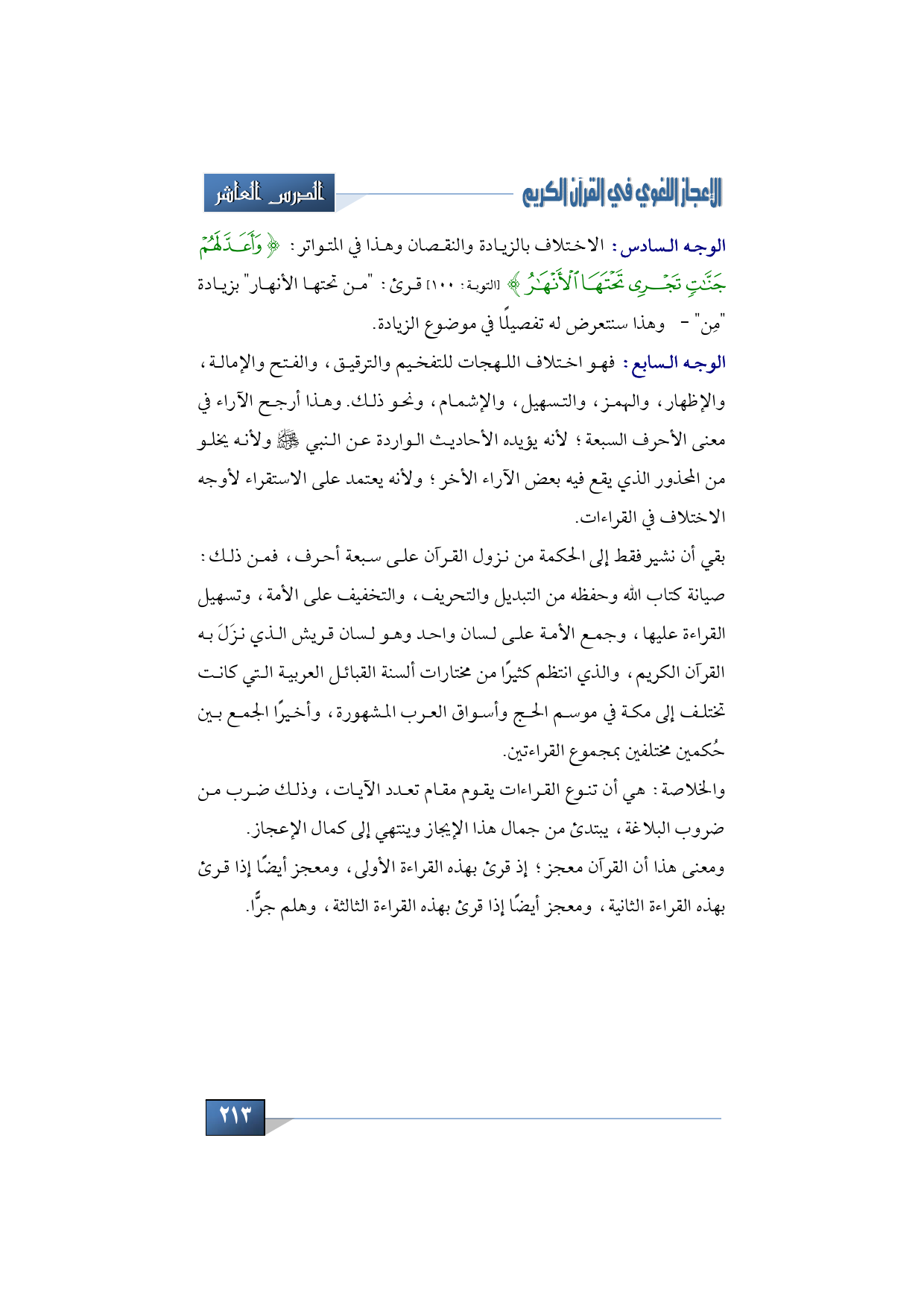 والوجه السادس للاختلاف: الاختلاف بالزيادة والنقصان وهذا في المتواتر: {وَأَعَدَّ لَهُمْ جَنَّاتٍ تَجْرِي تَحْتَهَا الْأَنْهَارُ} (التوبة: 100) قرئ: "من تحتها الأنهار" بزيادة "مِن" -وهذا سنتعرض له تفصيلًا في موضوع الزيادة-.